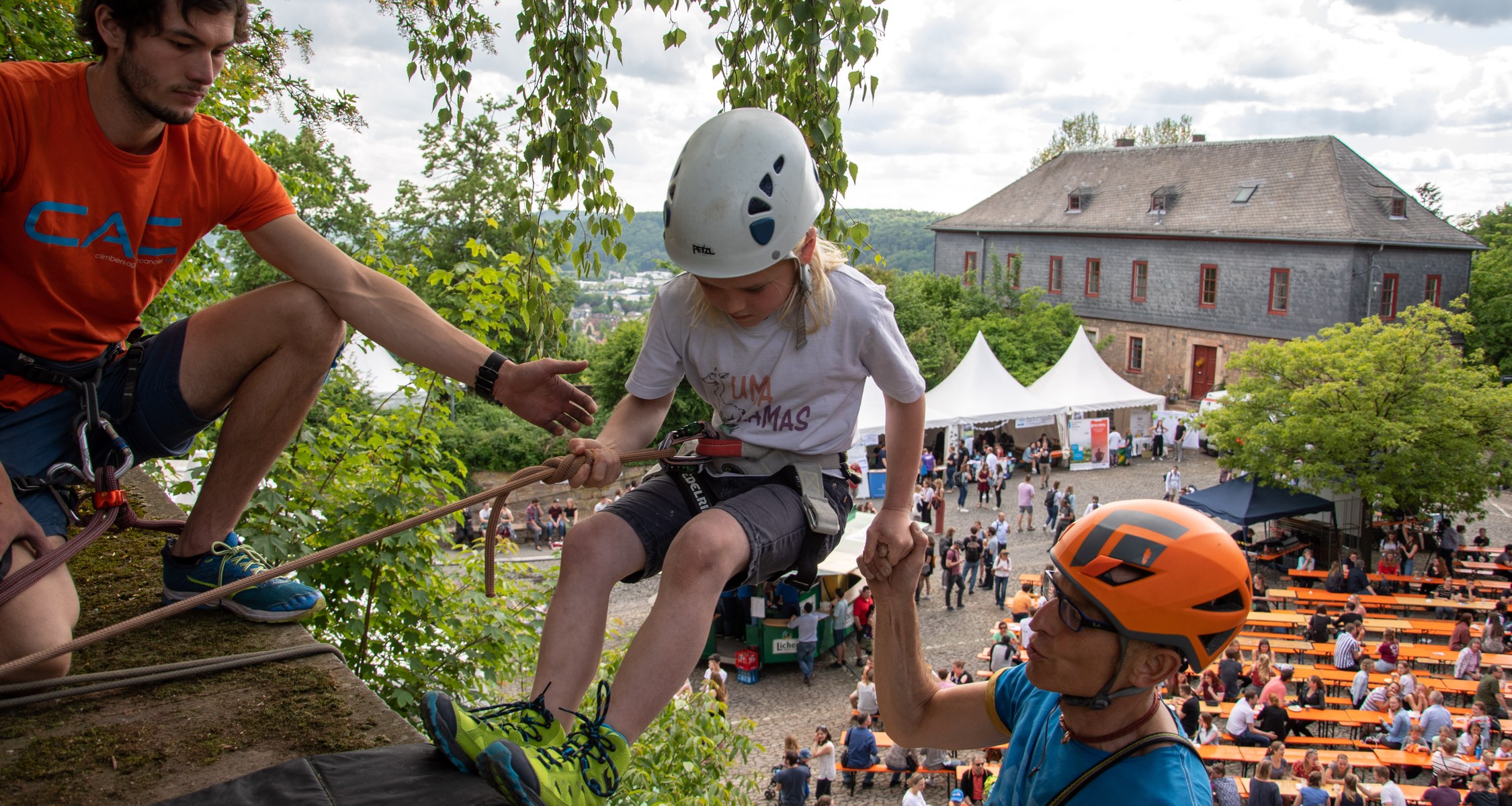 Familien hatten vor allem an den Bewegungs- und Mitmachangeboten rund um das Schloss Freude. Die reichten vom Abseilen an der Schlossmauer über Schminkangebote von studentischen Initiativen, Einblicken in Hochdruckverfahren im kunstpädagogischen Angebot des Kunstmuseums bis zu Bewegungsspielen des Zentrums für Hochschulsport.