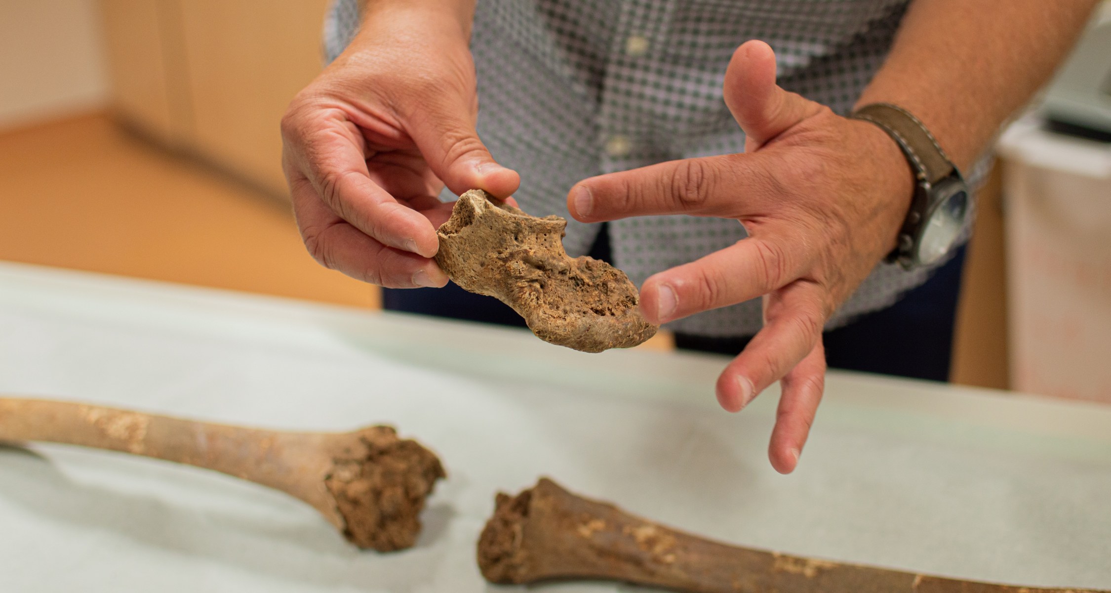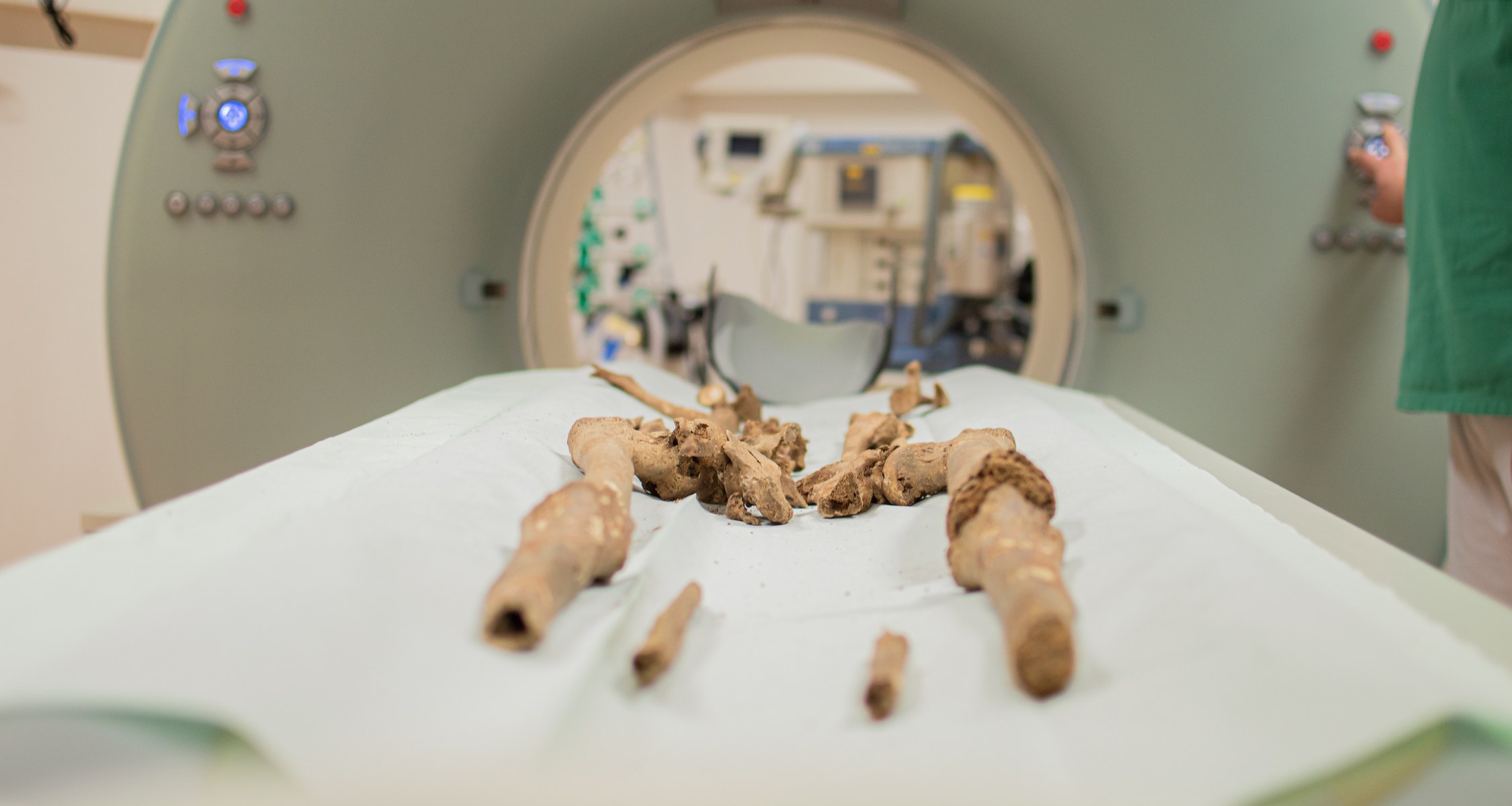 In einem weiteren Grab wurde GER-4730 bestattet. „Nach Ausweis der beigegebenen Objekte, wie einem spätrömischen Militärgürtel sowie anhand der anthropologischen Untersuchungen der Münchner Kollegen, handelt es sich aller Wahrscheinlichkeit nach um einen römischen Offizier, der im Alter von ca. 50 bis 60 Jahren verstorben ist“, so Dürr. Bei der anthropologischen Befundung der 29 Bestatteten durch eine Anthropologin der Staatsammlung für Anthropologie und Paläoanatomie München (SAPM) wurde ebenfalls eine blumenkohlartige Wulst an einem Stück des Hüftknochens von Patient GER-4730 festgestellt. „Es deutete Vieles darauf hin, dass es sich hier um ein Krebsgeschwulst gehandelt hat. Krebs befällt meistens Weichgewebe, aber es gibt auch Krebsarten, die auf den Knochen streuen können, darunter auch Prostatakrebs“, sagt Dürr. Um hier einen genaueren Befund stellen zu können, wurde weitere Expertise und Technik benötigt, deren Möglichkeiten über das übliche Equipment der Archäologie hinausgehen.