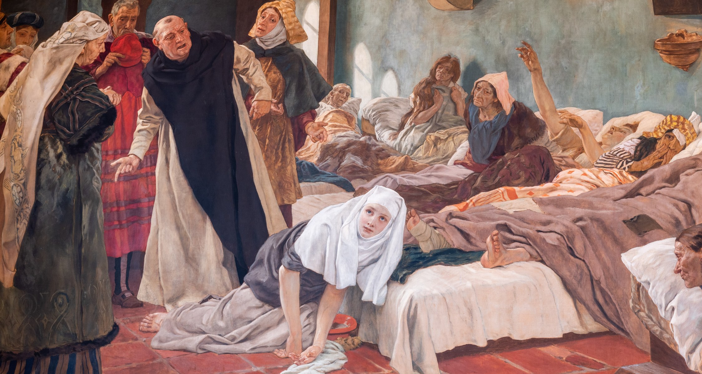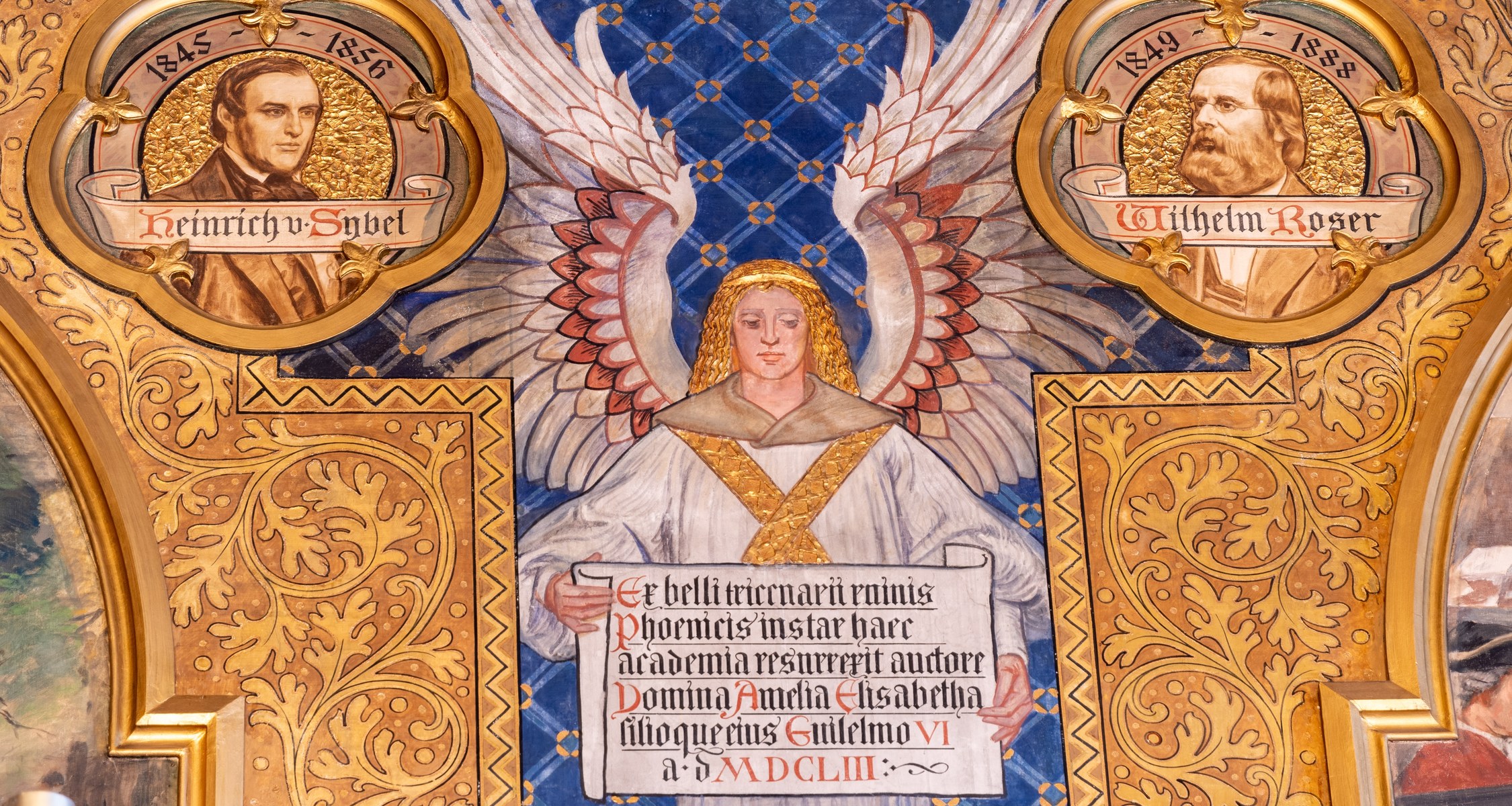 Vor rund zehn Jahren hatten extreme Wetterverhältnisse dazu geführt, dass Wasser in das Mauerwerk der Aula eindrang und die Wandmalereien unterhalb der Decke beschädigte. Ein Gutachten ergab, dass die Schäden an den Wandmalereien nicht fortschreitend waren. „Wir haben dann zunächst einmal das Dach in diesem Bereich saniert und konnten so weiteren Schäden vorbeugen“, sagt Maja Turba, Leiterin der universitären Bauabteilung und Sicherheitstechnik.