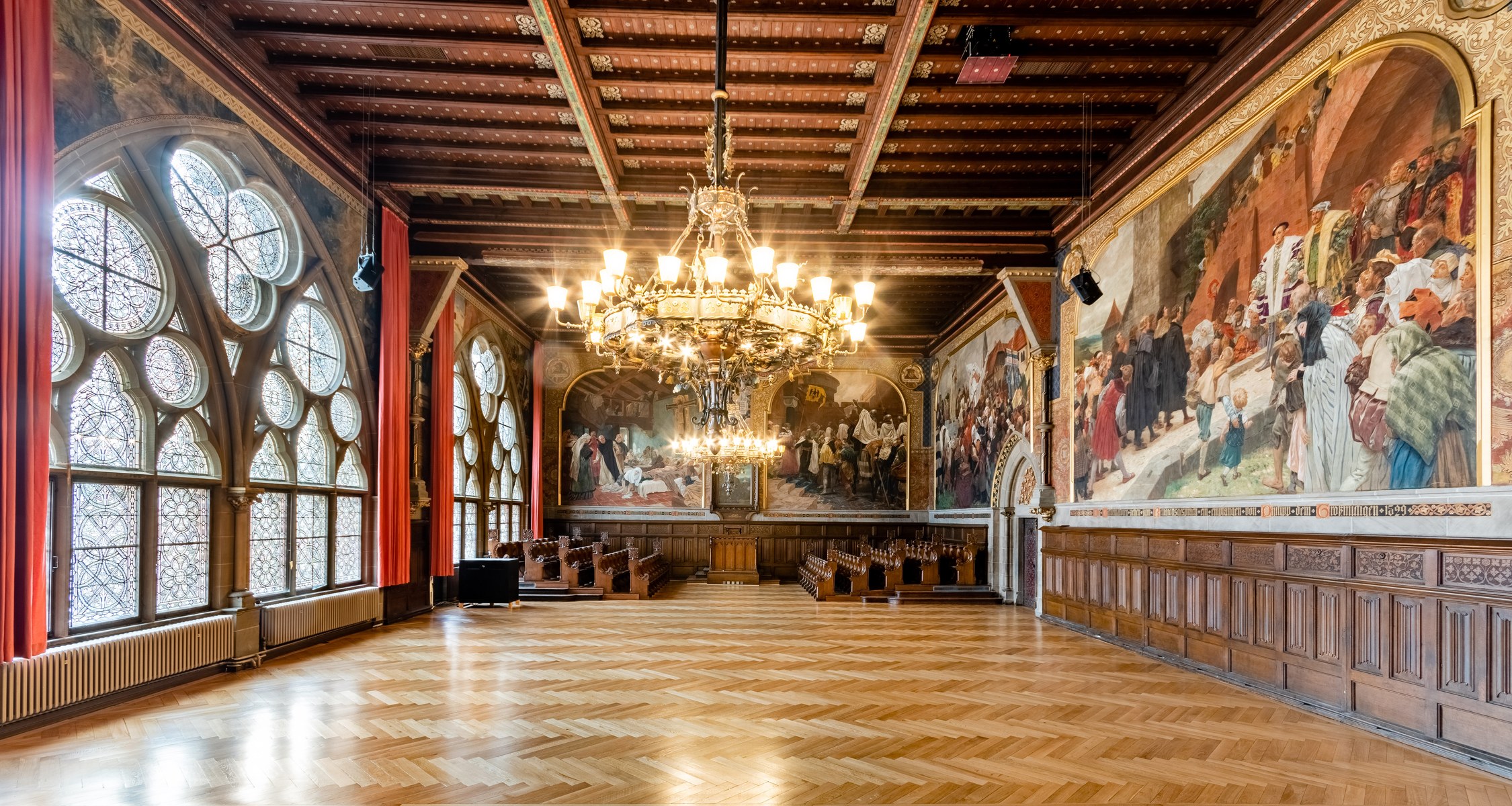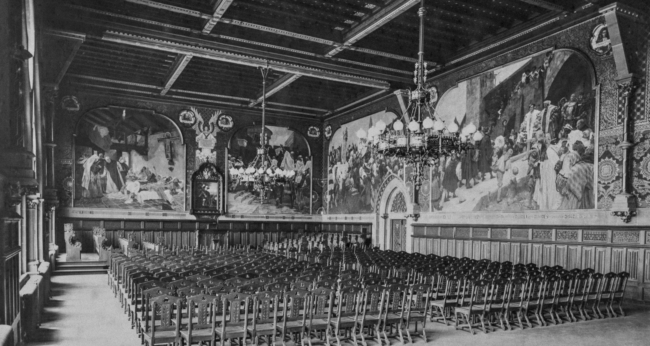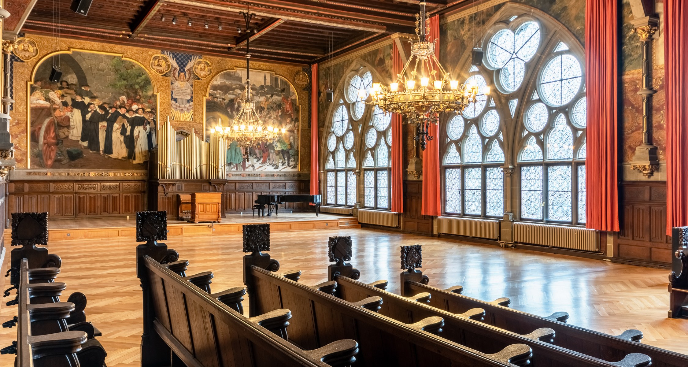 Die Aula ist bis heute das Herzstück der Alten Universität. Eingeweiht wurde sie vor 130 Jahren, am 26. Juni 1891. Die Feier fand damals in einem Saal statt, in dem wesentliche Teile der Ausstattung noch fehlten. Der Entwurf für die Inneneinrichtung stammte von dem Frankfurter Architekten und Glasmaler Alexander Linnemann. Von seiner Freude am Ornamentalen zeugen noch heute die reich bemalte, freitragende Holzbalkendecke, die Wandtäfelung und zwei prächtige Kronleuchter sowie das geschnitzte Professorengestühl und die in Grisaille-Technik bemalten Fenster. Die Stühle für das Publikum im Saal sind leider verloren.