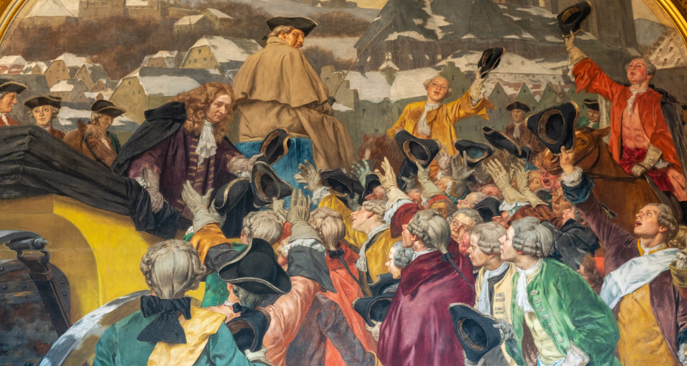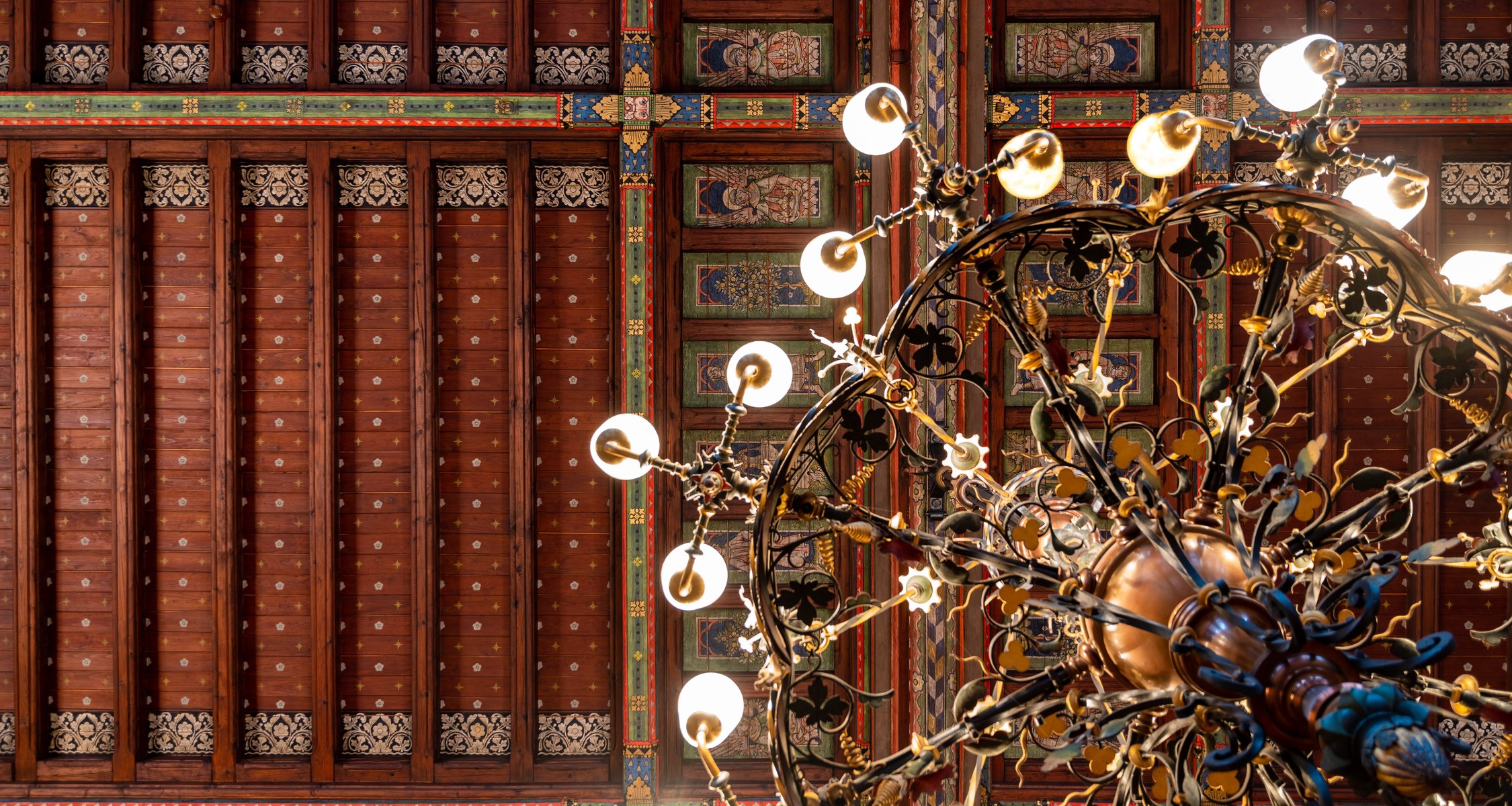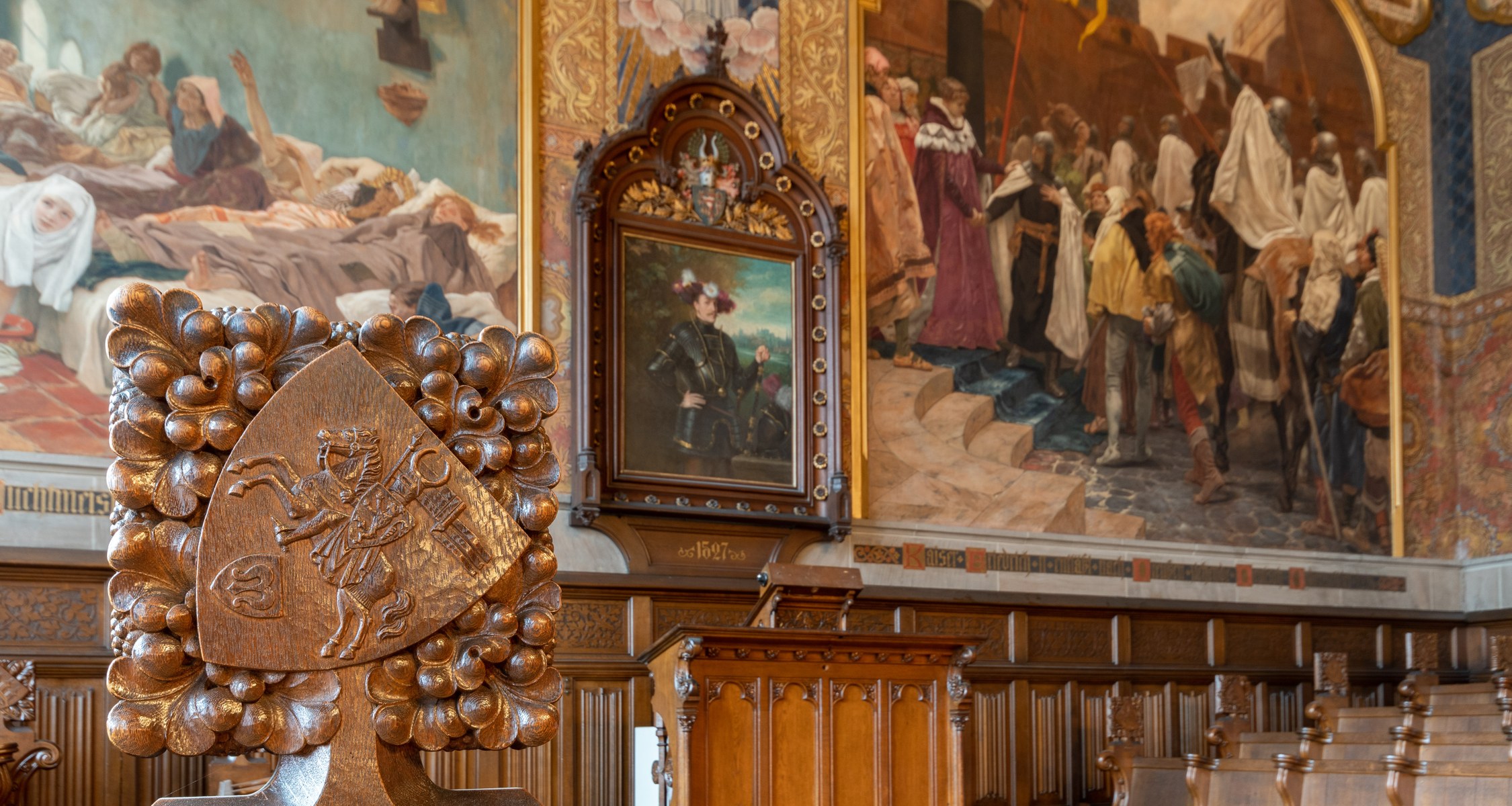 Die Aula ist bis heute das Herzstück der Alten Universität. Eingeweiht wurde sie vor 130 Jahren, am 26. Juni 1891. Die Feier fand damals in einem Saal statt, in dem wesentliche Teile der Ausstattung noch fehlten. Der Entwurf für die Inneneinrichtung stammte von dem Frankfurter Architekten und Glasmaler Alexander Linnemann. Von seiner Freude am Ornamentalen zeugen noch heute die reich bemalte, freitragende Holzbalkendecke, die Wandtäfelung und zwei prächtige Kronleuchter sowie das geschnitzte Professorengestühl und die in Grisaille-Technik bemalten Fenster. Die Stühle für das Publikum im Saal sind leider verloren.