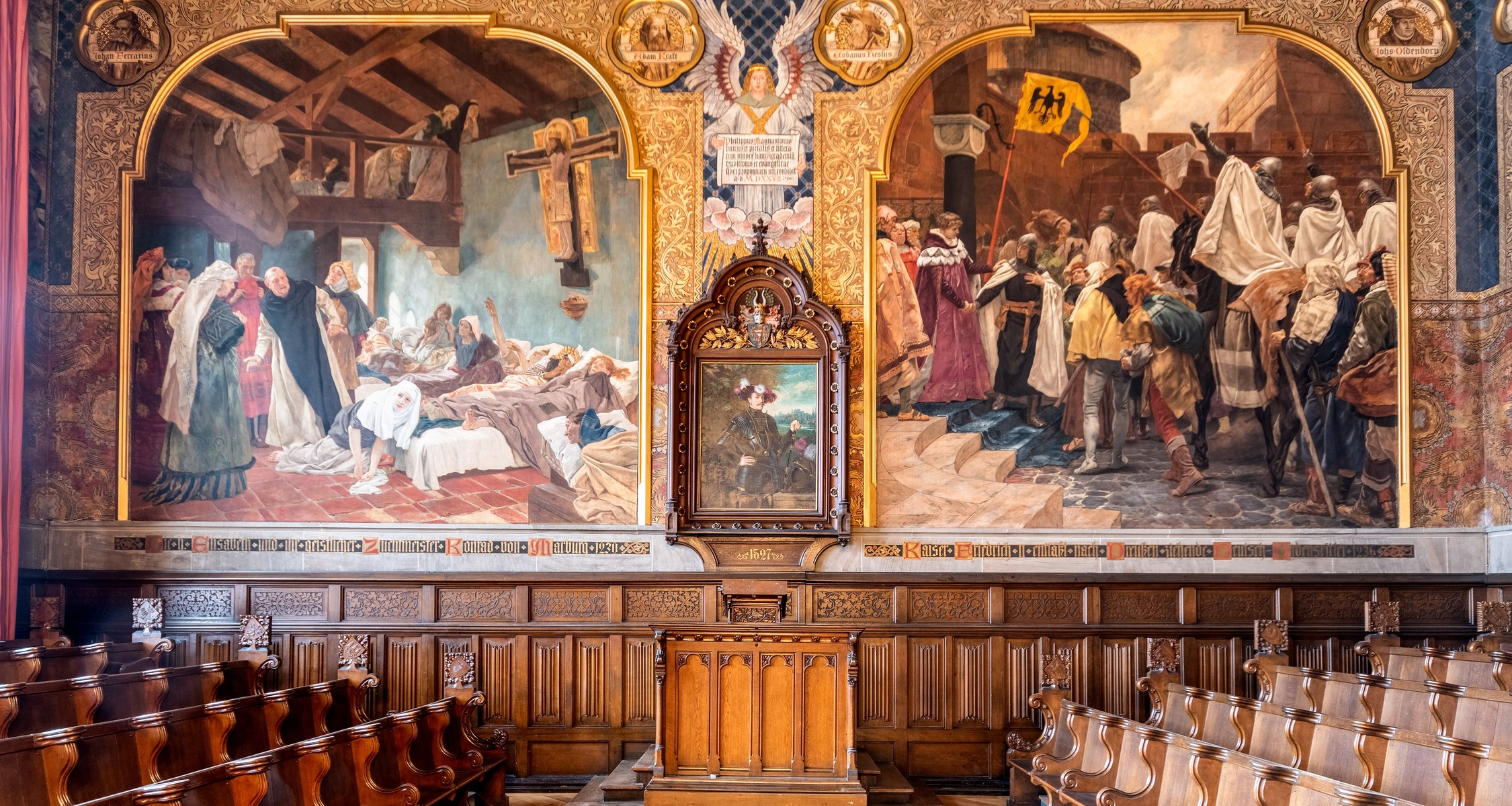 Die Alte Aula wird an drei Seiten von Wandmalereien und großformatigen Gemälden gerahmt, die Szenen aus der Geschichte von Stadt und Universität nachzeichnen. Der Maler Johann Peter Theodor Jansen hatte die Leinwandgemälde zwischen 1900 und 1903 angefertigt. Im Zentrum stehen unterschiedliche Sujets, wie etwa die Heilige Elisabeth bei der Krankenpflege, der Einzug der Reformatoren zum Marburger Religionsgespräch oder auch der begeisterte Empfang des Philosophen Christian Wolff. Die Gemälde werden von ornamentalen Wandmalereien eingefasst, die an Brokatstoffe erinnern.