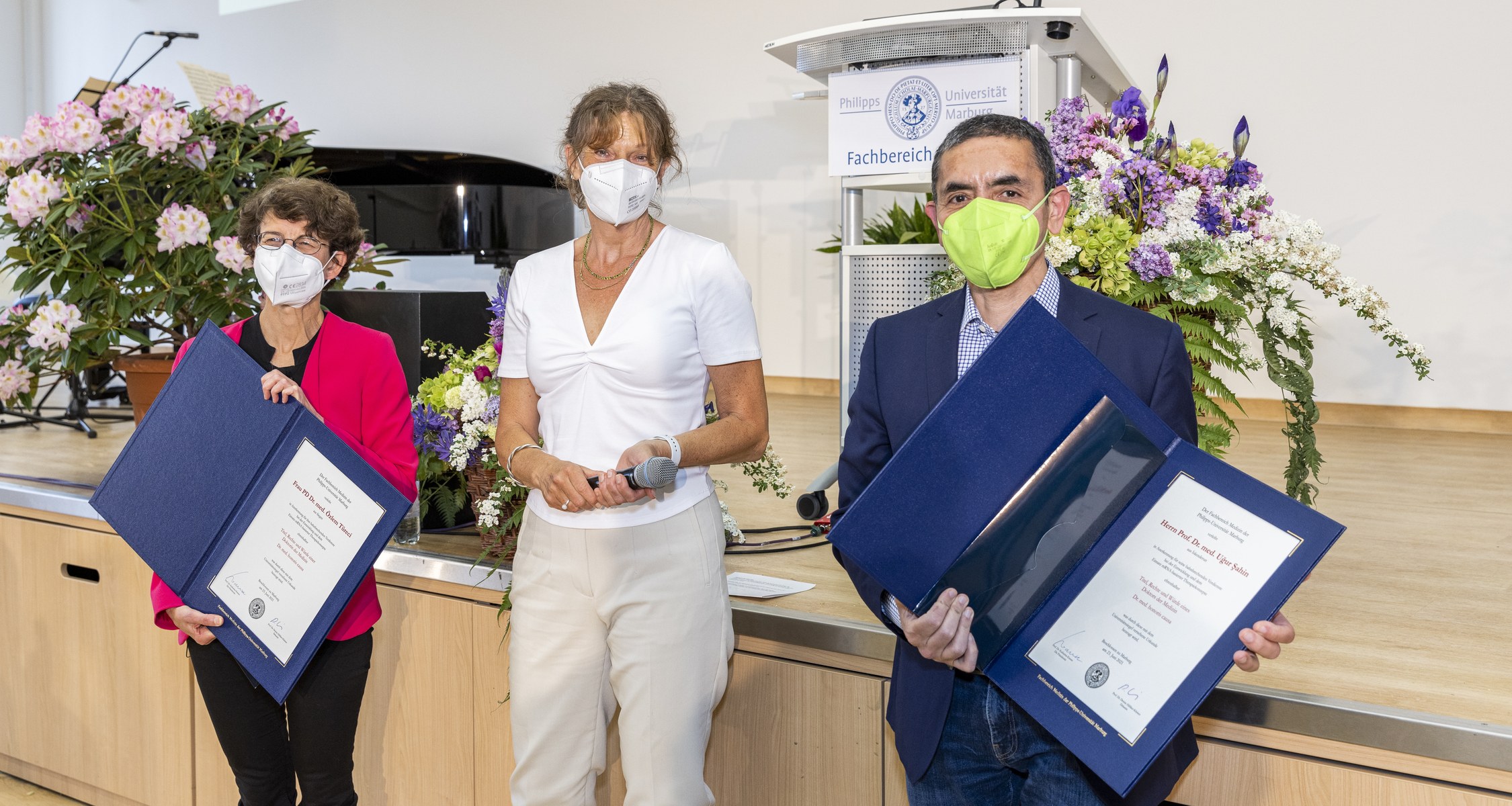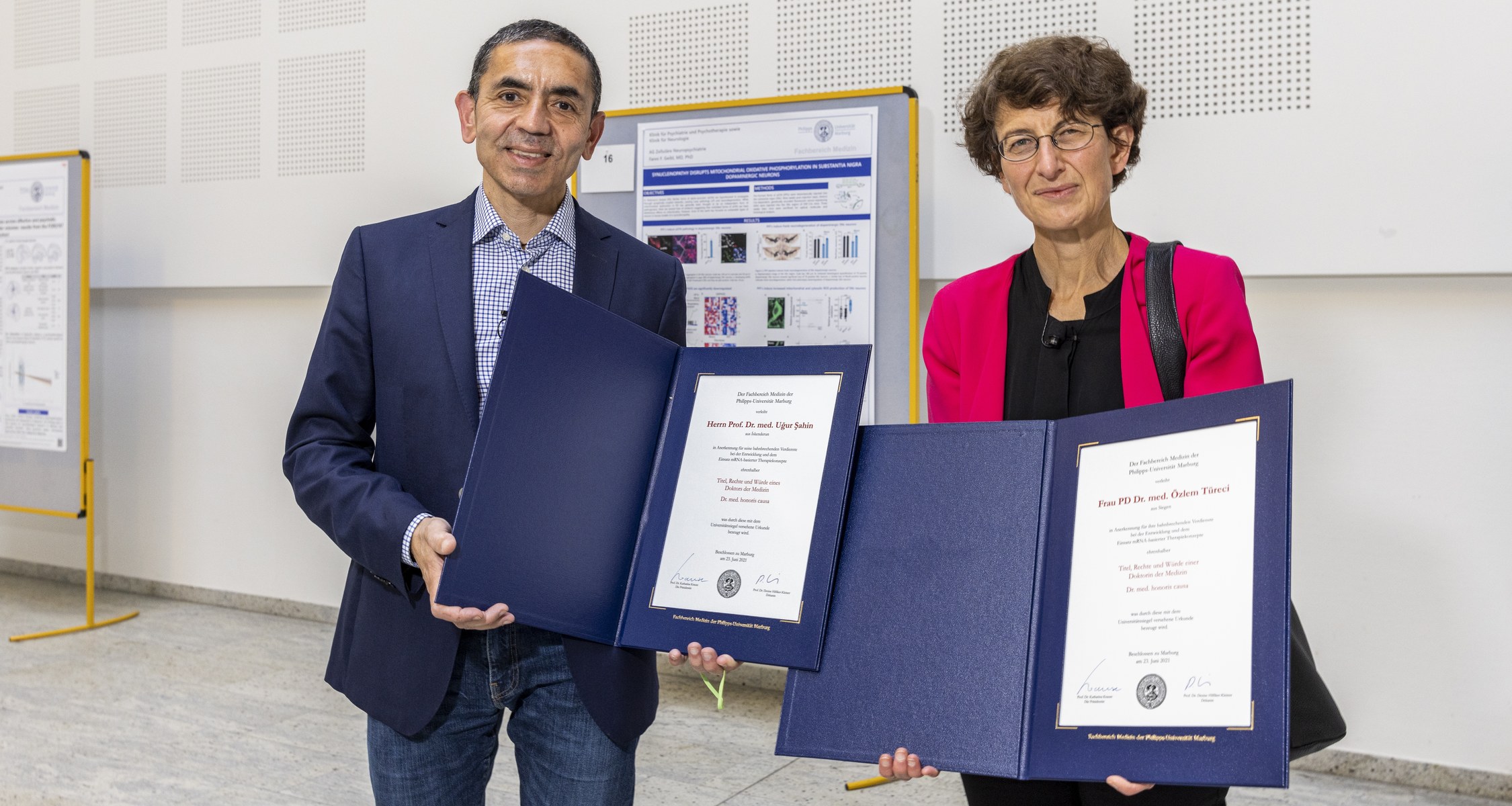 In feierlichem Rahmen haben die Dekanin des Fachbereich Medizin, Prof. Dr. Denise Hilfiker-Kleiner und der Präsident der Philipps Universität Marburg, Prof. Dr. Thomas Nauss Özlem Türeci und Uğur Şahin die Urkunden für die Ehrendoktorwürde des Fachbereichs Medizin im Auditorium des Universitätsklinikums überreicht.