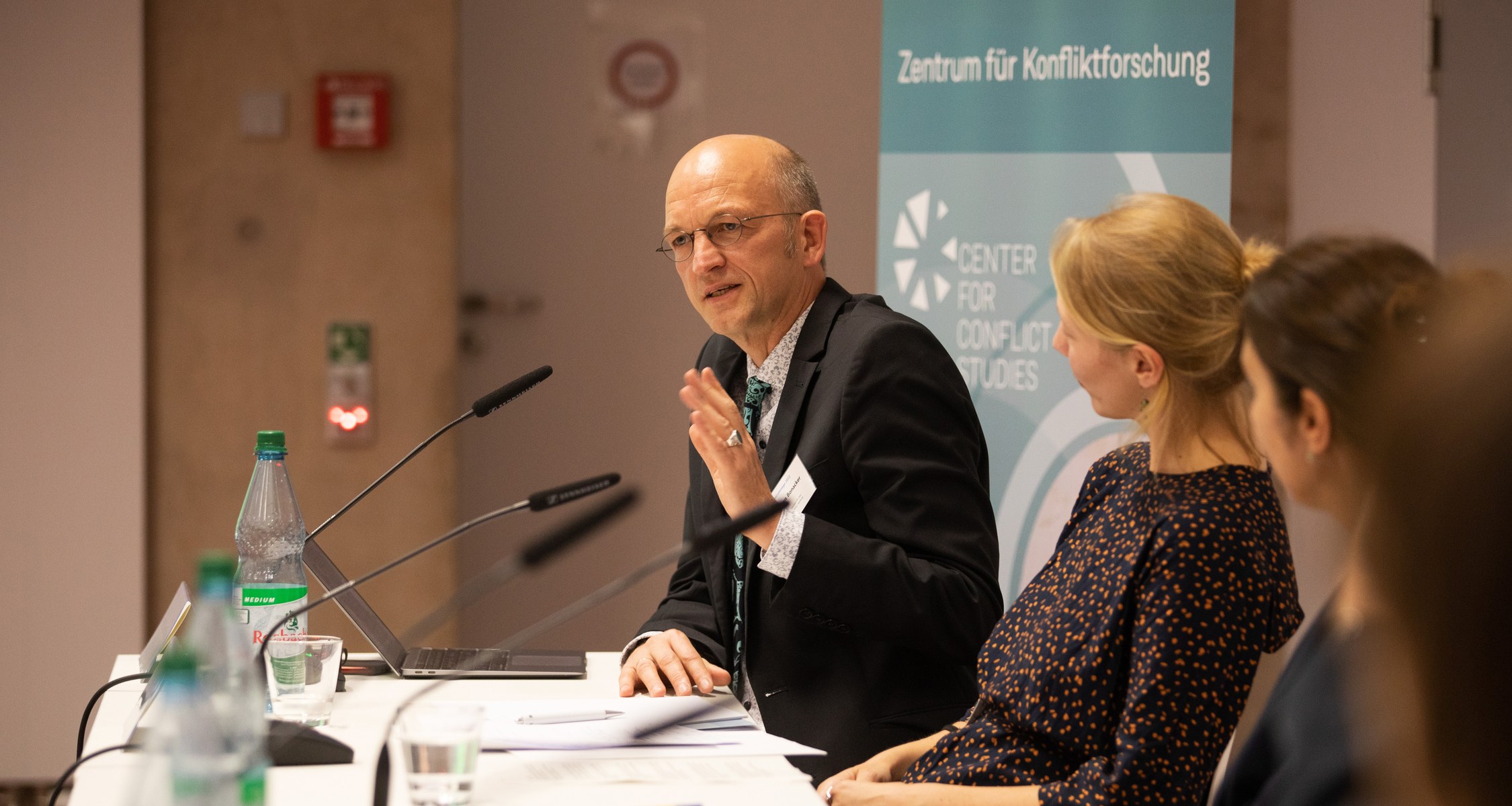 Universitätspräsident Prof. Dr. Thomas Nauss betonte: „Friedens- und Konfliktforschung ist in Marburg ein zentrales Thema, denn die Beschäftigung mit Konflikten ist immer von Relevanz. Die Erkenntnisse der Friedens- und Konfliktforschung sind eine Basis für die Friedensfähigkeit.“ An die Mitarbeiter*innen des ZfK appellierte er: „Stellen Sie sich weiterhin neugierig und entschlossen den Herausforderungen unserer Zeit.“