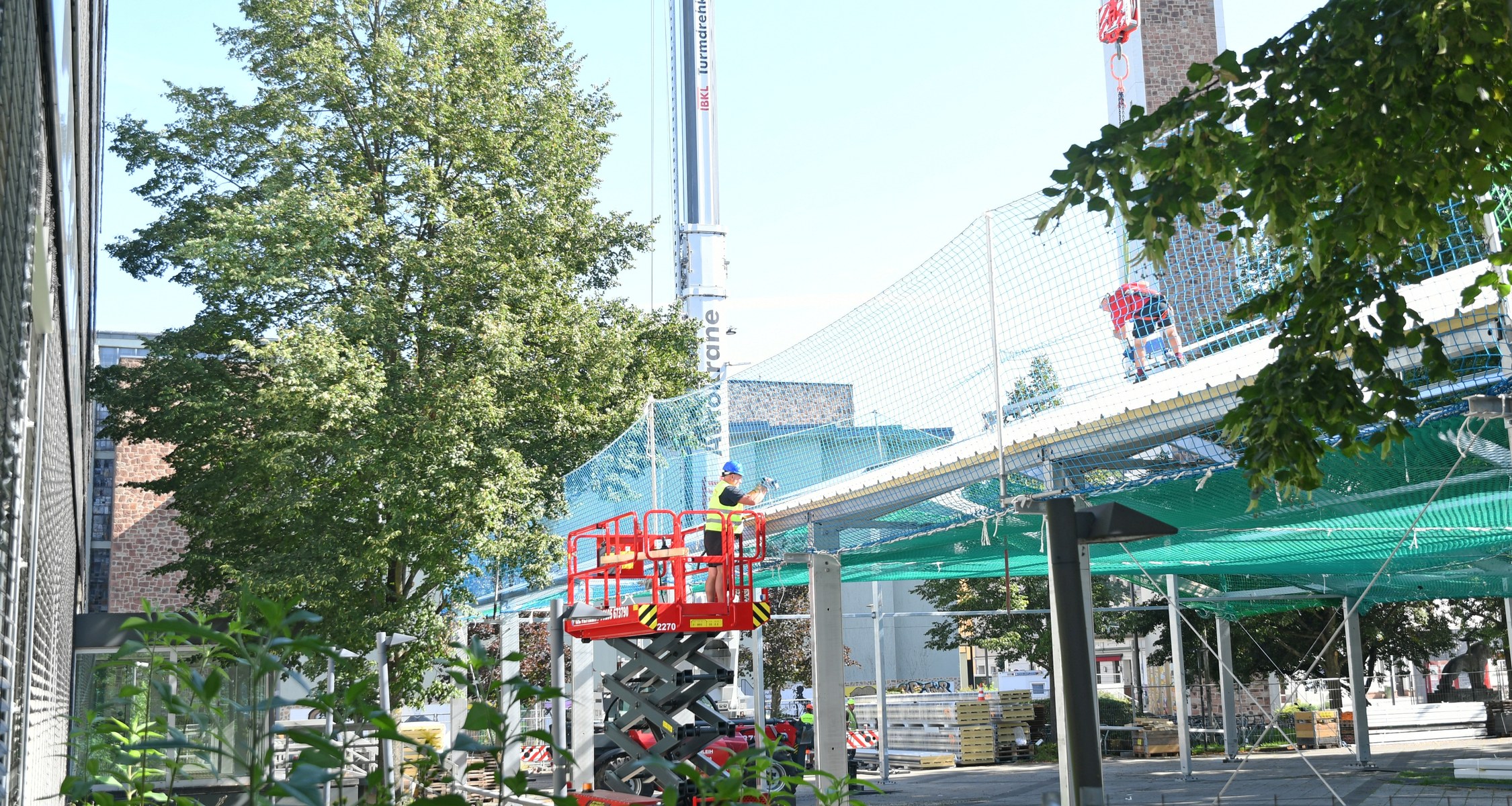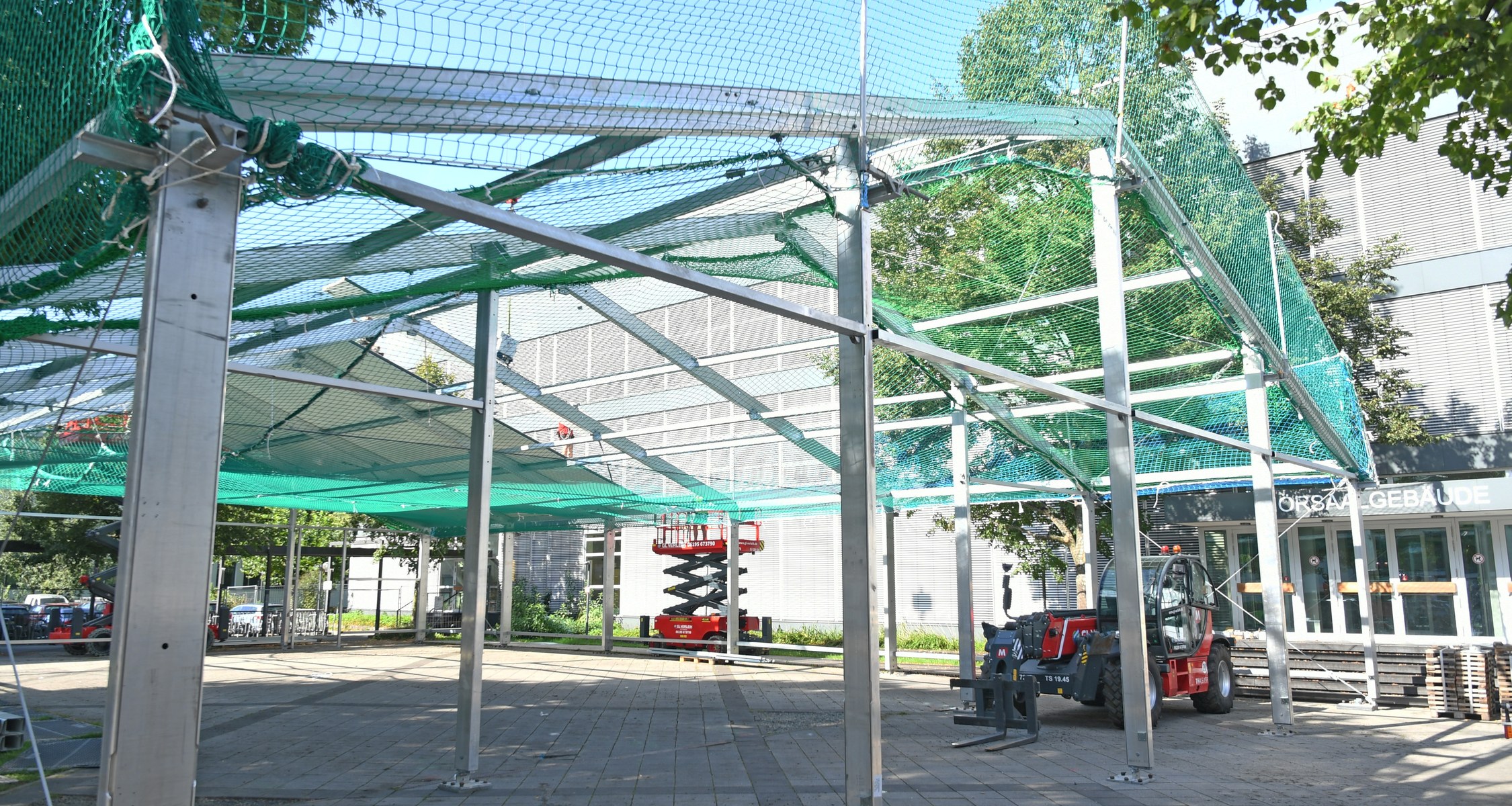 „Die Sanierung des Hörsaalgebäudes ist unser nächster Schritt zur energieeffizienten Universität“, fasst Universitätspräsident Prof. Dr. Thomas Nauss die Sanierungsarbeiten kurz zusammen. „Gleichzeitig wird die Sanierung genutzt, um die Technik in den Hörsälen fit fürs 21. Jahrhundert zu machen.“ Für alle sichtbar wird vor dem Hörsaalgebäude ein Bauzaun errichtet, damit auf dem Platz vor dem Gebäude ein Interims-Hörsaal mit 560 Plätzen in Leichtbauweise errichtet werden kann. Denn Räume sind an der Universität Mangelware. Die Leichtbauhalle soll zum Semesterbeginn voll ausgestattet zur Verfügung stehen.