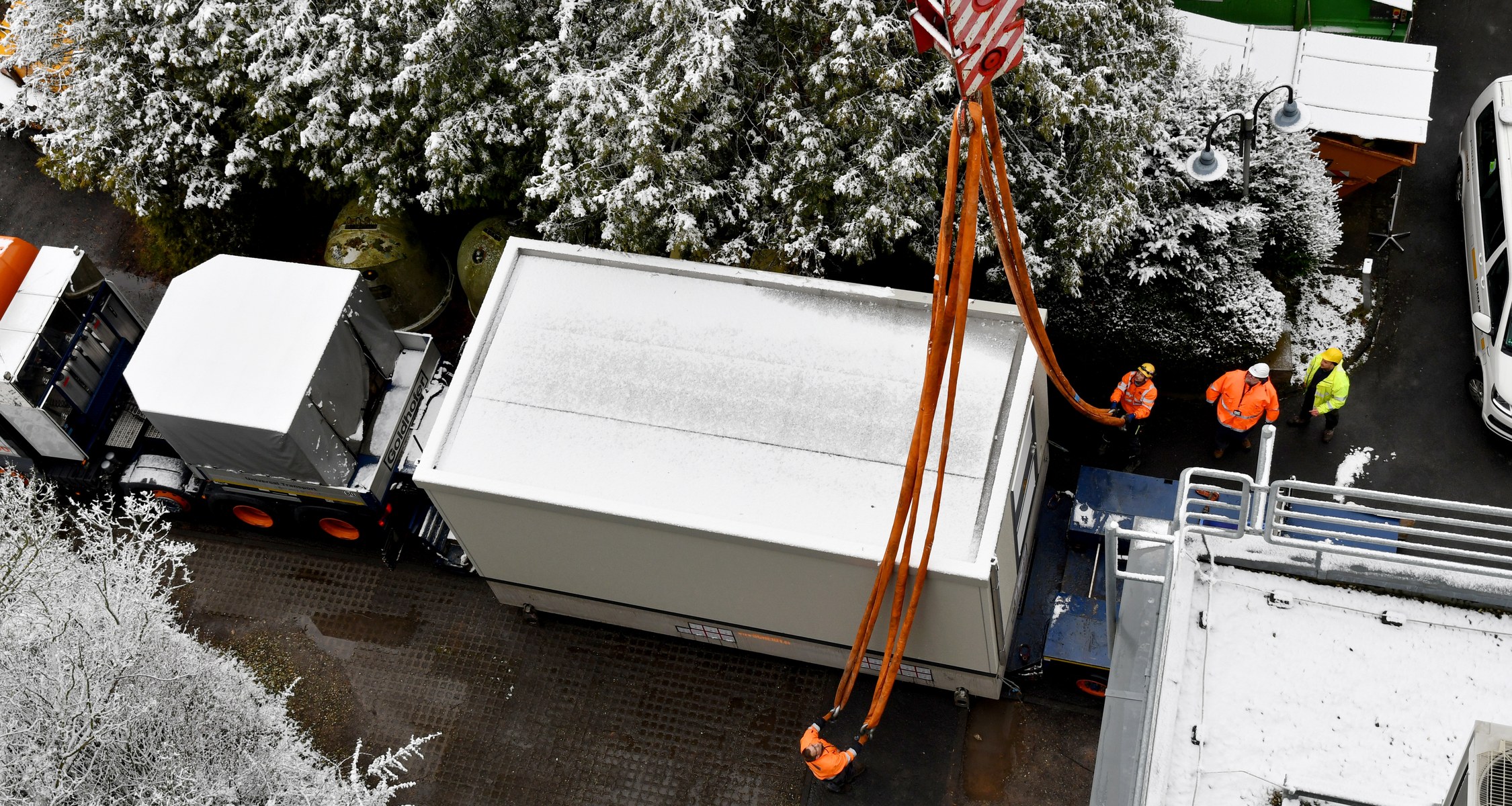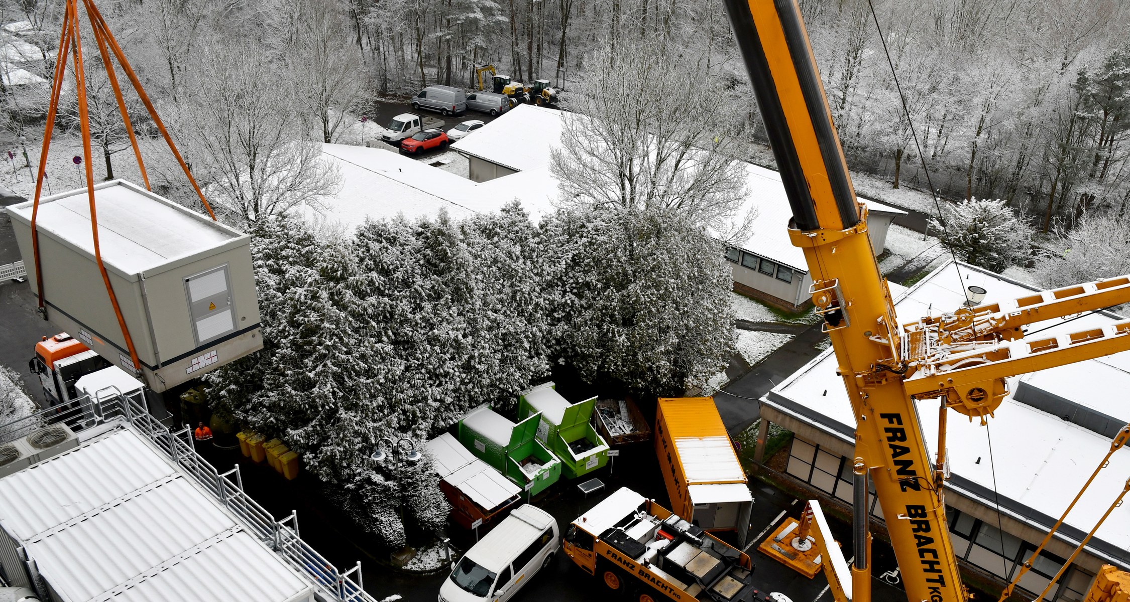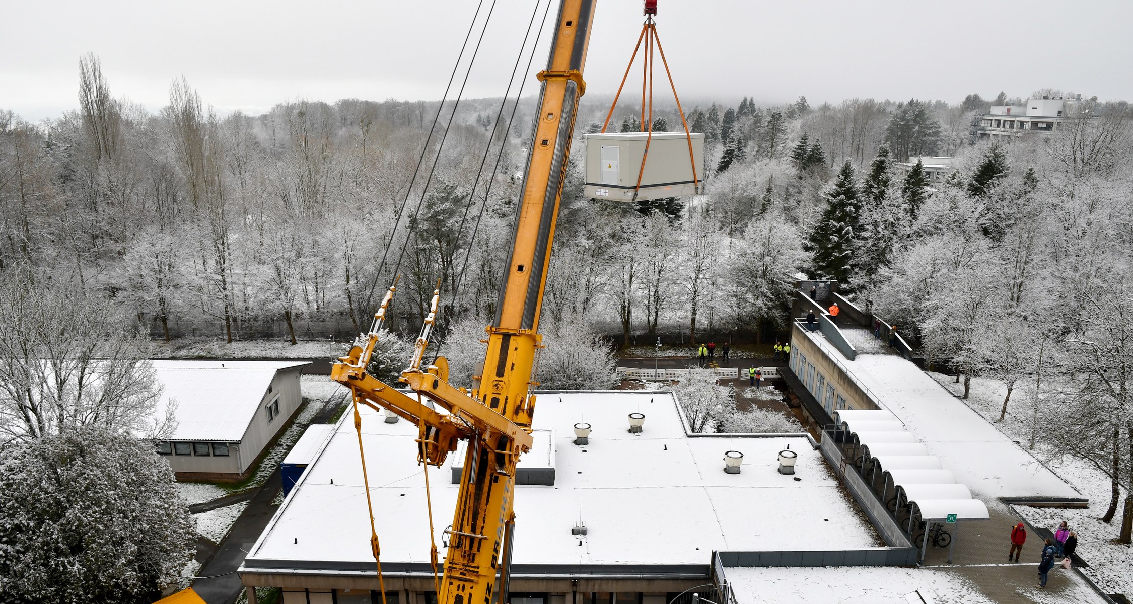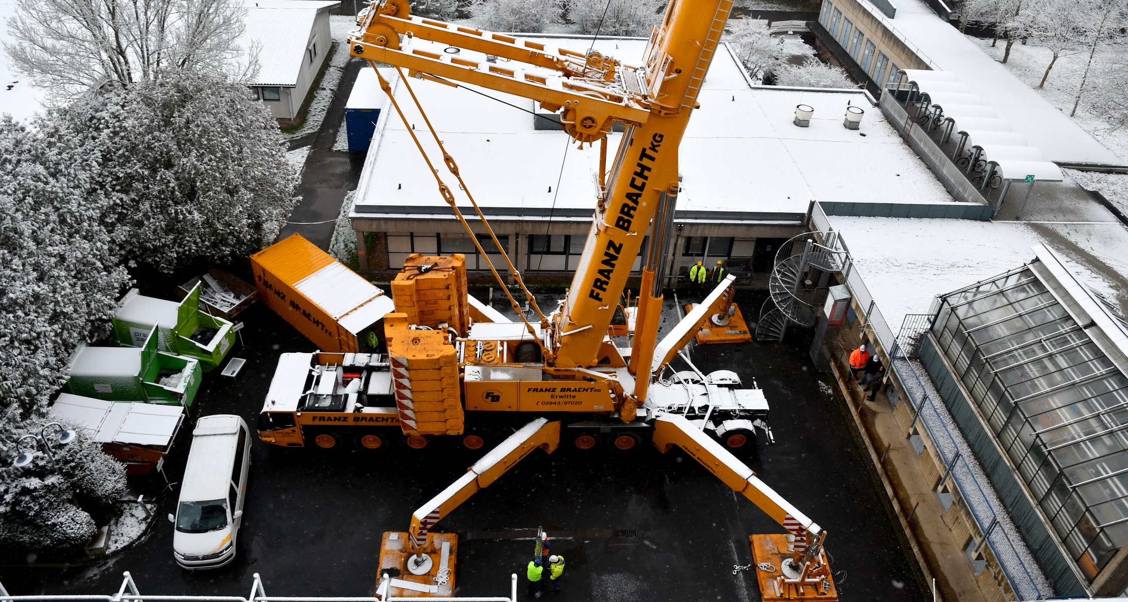 16.03.2023 Riesenkran hebt neue Schaltanlage über Biologiegebäude