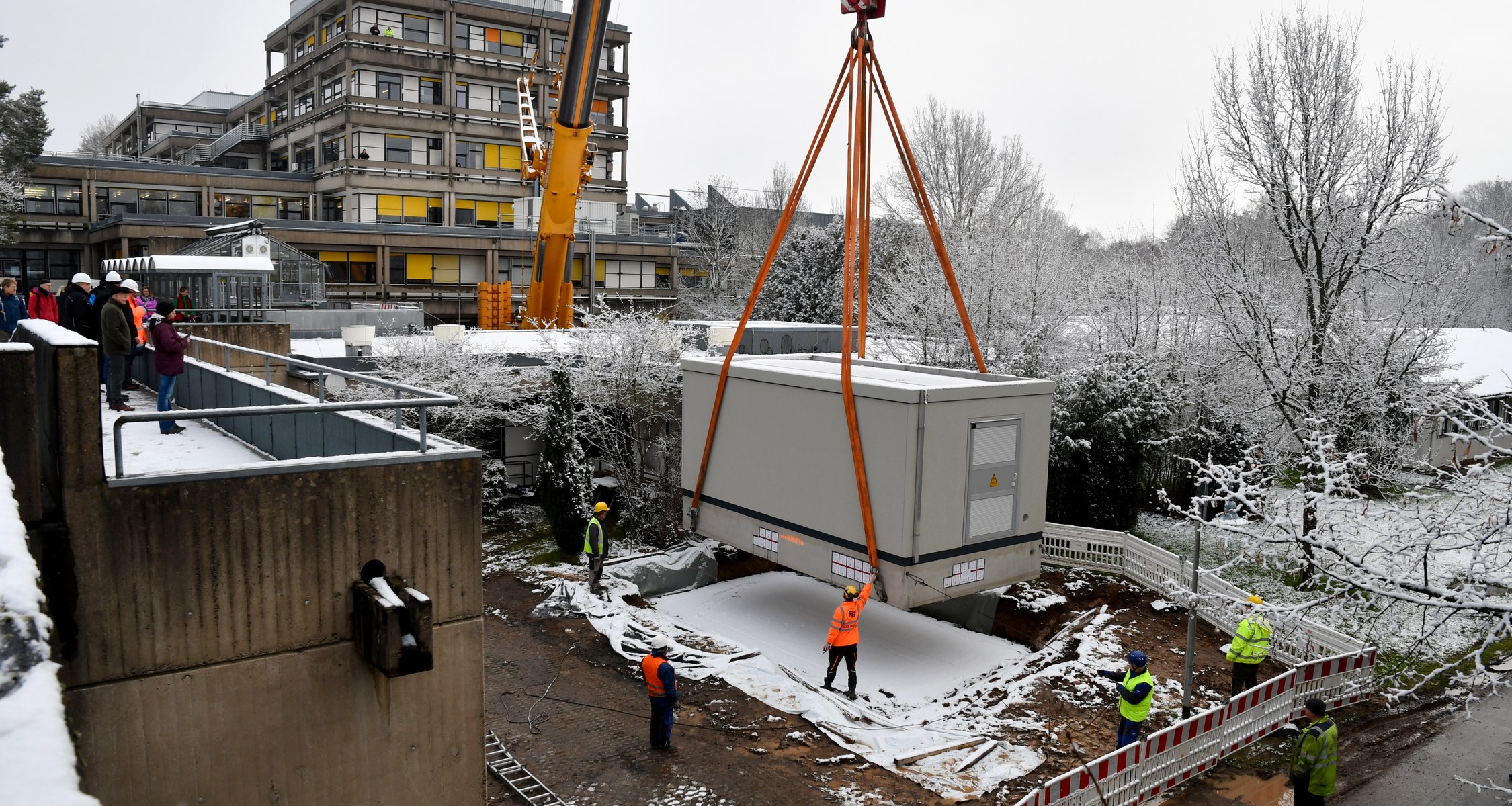 Auf dem Campus Lahnberge der Philipps-Universität Marburg wurde am Mittwoch, 15. März 2023, mit einem riesigen Mobilkran mit 700 Tonnen Traglast eine neue Schaltanlage für die Stromversorgung des Fachbereichs Biologie an ihren Bestimmungsort gebracht. Die Schaltanlage mit einem Gewicht von etwa 40 Tonnen musste in einer spektakulären Aktion über ein Gebäude der Biologie gehoben werden. Der ungewöhnlich große Kran war wegen des außergewöhnlich langen Hebewegs und des hohen Gewichts der Station notwendig. Es war einer der größten Kräne, der in den vergangenen Jahrzehnten auf Uni-Gelände zum Einsatz gekommen ist. Die beiden Abteilungen Tiefbau und Stromversorgung des Dezernats Gebäudemanagement und Technik der Universität realisierten das Projekt gemeinsam.
