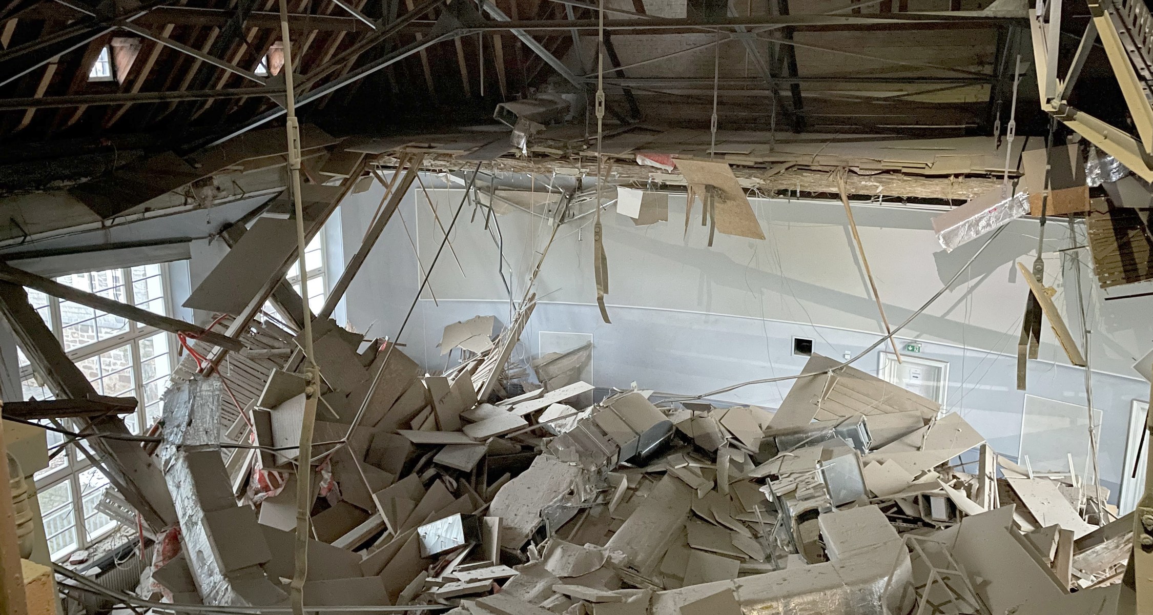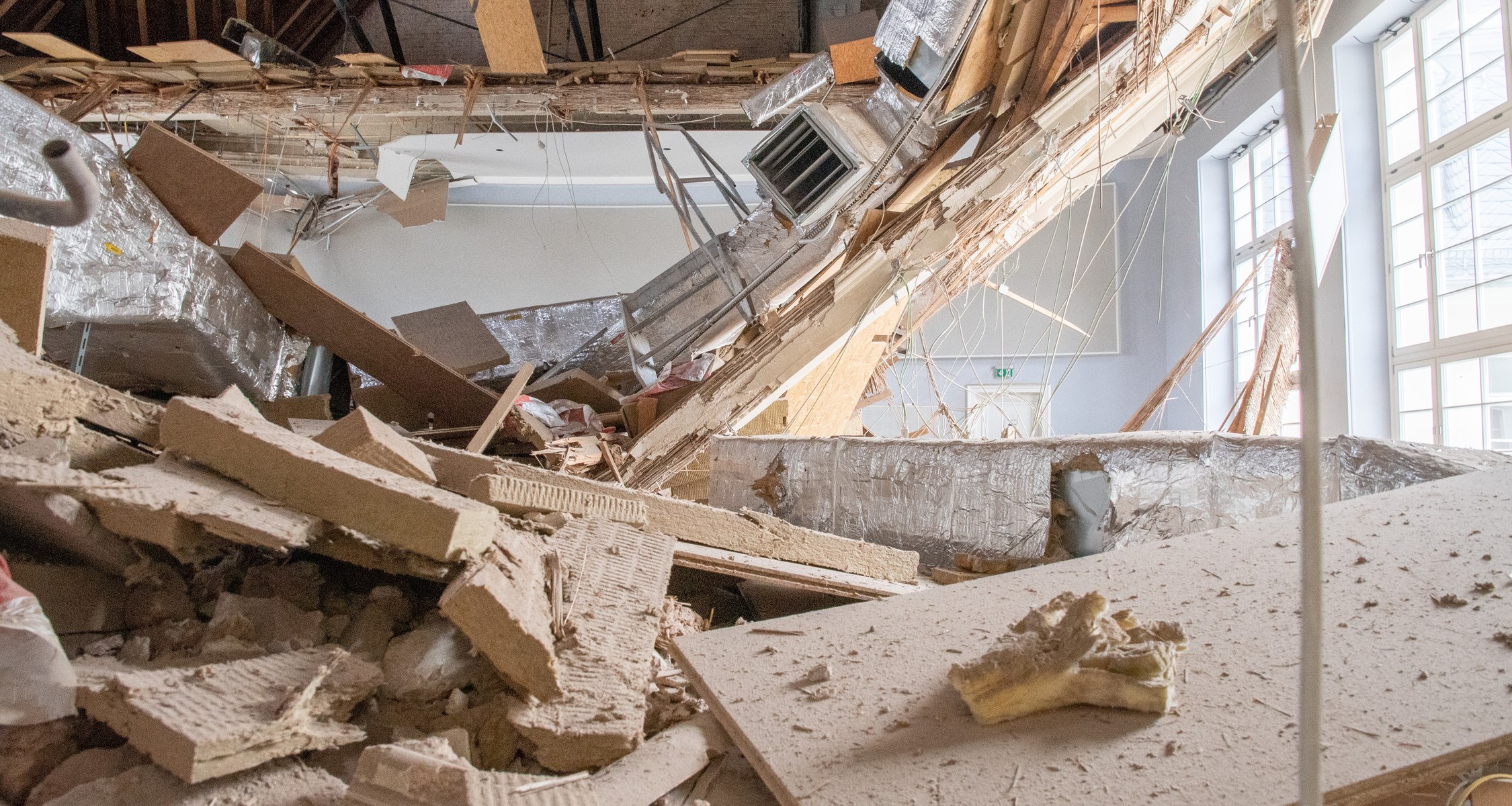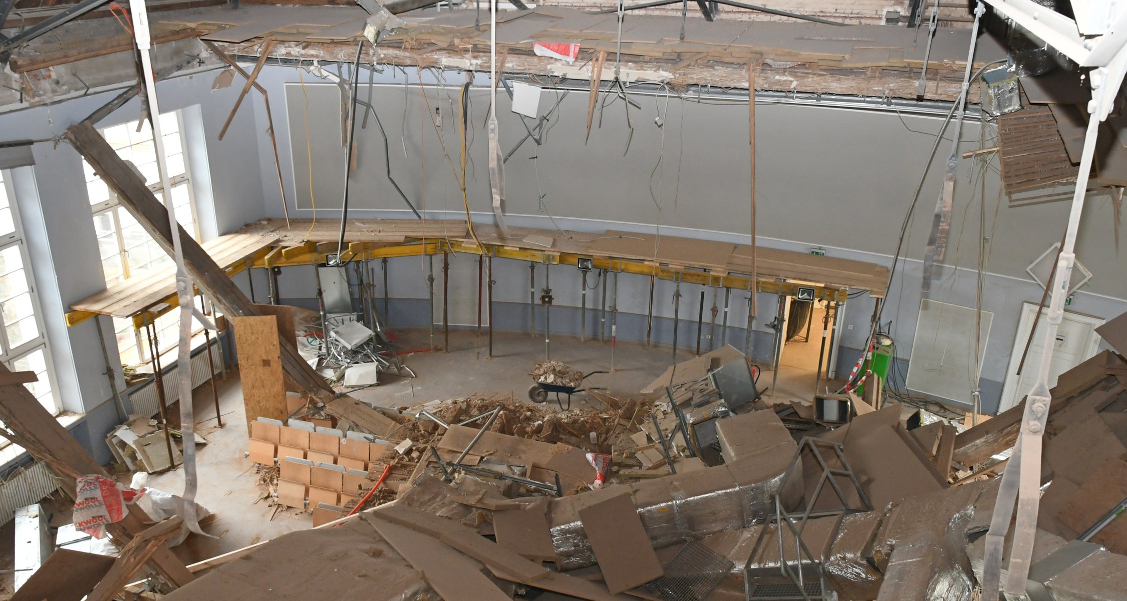 Die eingebrochene Decke ist eine historische Holz-Kassettendecke. Das Gebäude wurde 1924 erbaut. Bei einer Dach- und Brandschutzsanierung zwischen 2010 und 2012 wurde auch die Lüftungsanlage erneuert. Über der Decke befindet sich der Dachboden und das Dach des Gebäudes, das von einer Stahlkonstruktion getragen wird.
