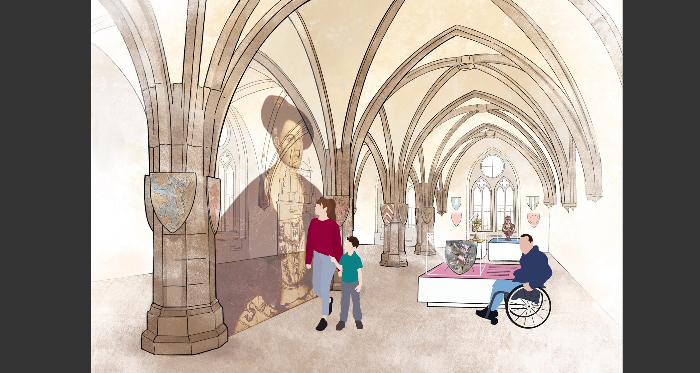 Schon der Empfang der Schlossbesucher*innen wird in dem visionären Konzept ganz neu konzipiert: Ein Besuchszentrum als ersten Anlaufpunkt schlagen die Architekt*innen des von der Universität beauftragten Büros vor – in Form eines Neubaus zwischen dem Schlosspark und der Burg am Rande des heutigen Parkplatzes. Denkbar wäre auch ein Zentrum auf der Nordterrasse. Dabei orientieren sich die Planer*innen an den Dimensionen der historischen Bebauung, die es früher an diesem Ort gab. So stand einst eine Schmiede am Rand des Parkplatzes und ein Wirtschaftsgebäude auf der Rückseite des Schlosses. Das Zentrum soll Platz für Informationsschalter, Museumsshop, Warte- und Medienraum, sanitäre Anlagen und Schließfächer bieten.
