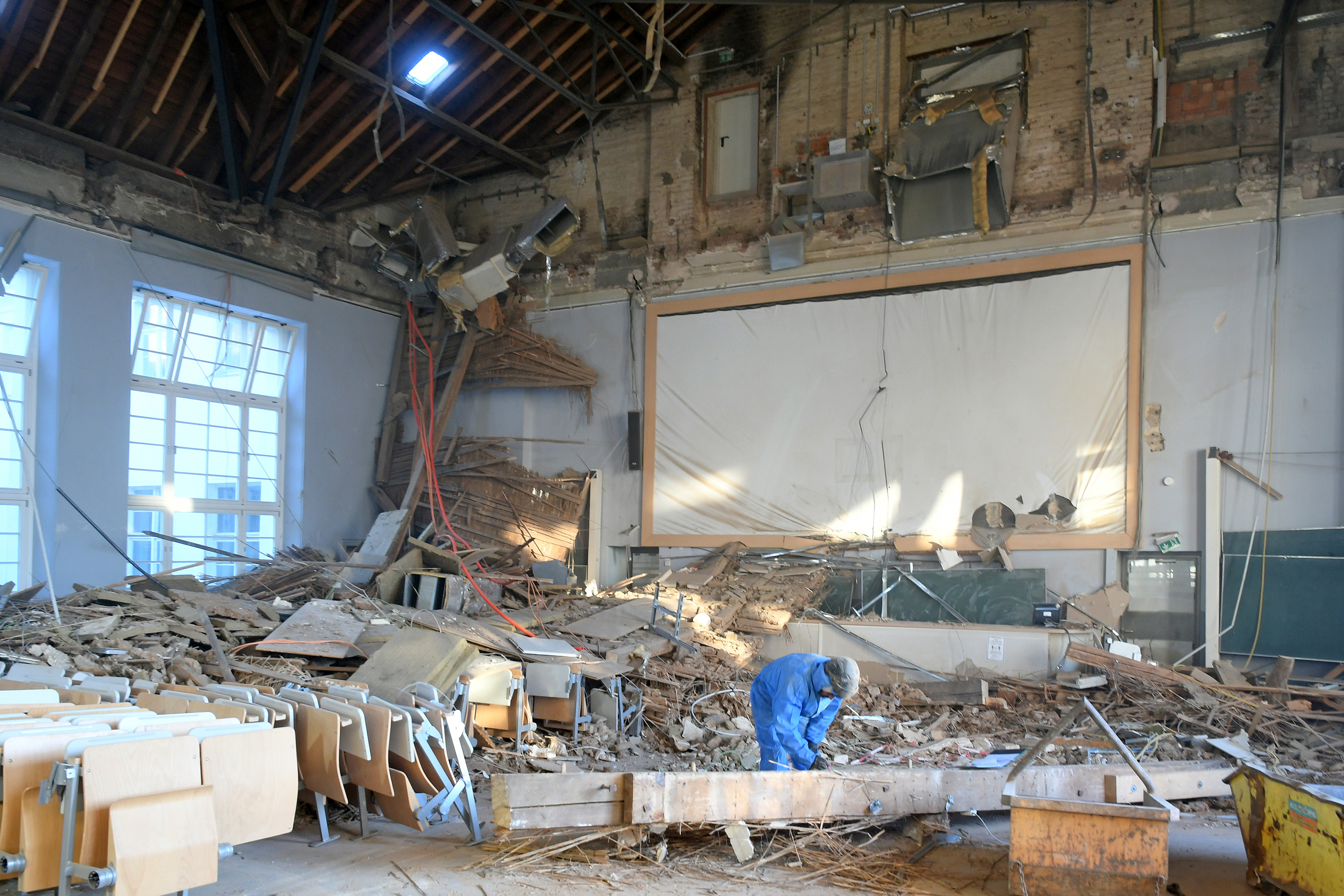 Eine Spezialfirma hatte bereits Mitte Dezember angefangen, den Schutt aus dem Hörsaal zu räumen. Die Aufräumarbeiten dauerten länger als geplant, weil kein großes Gerät eingesetzt werden konnte und der gesamte Schutt in Handarbeit entfernt werden musste.