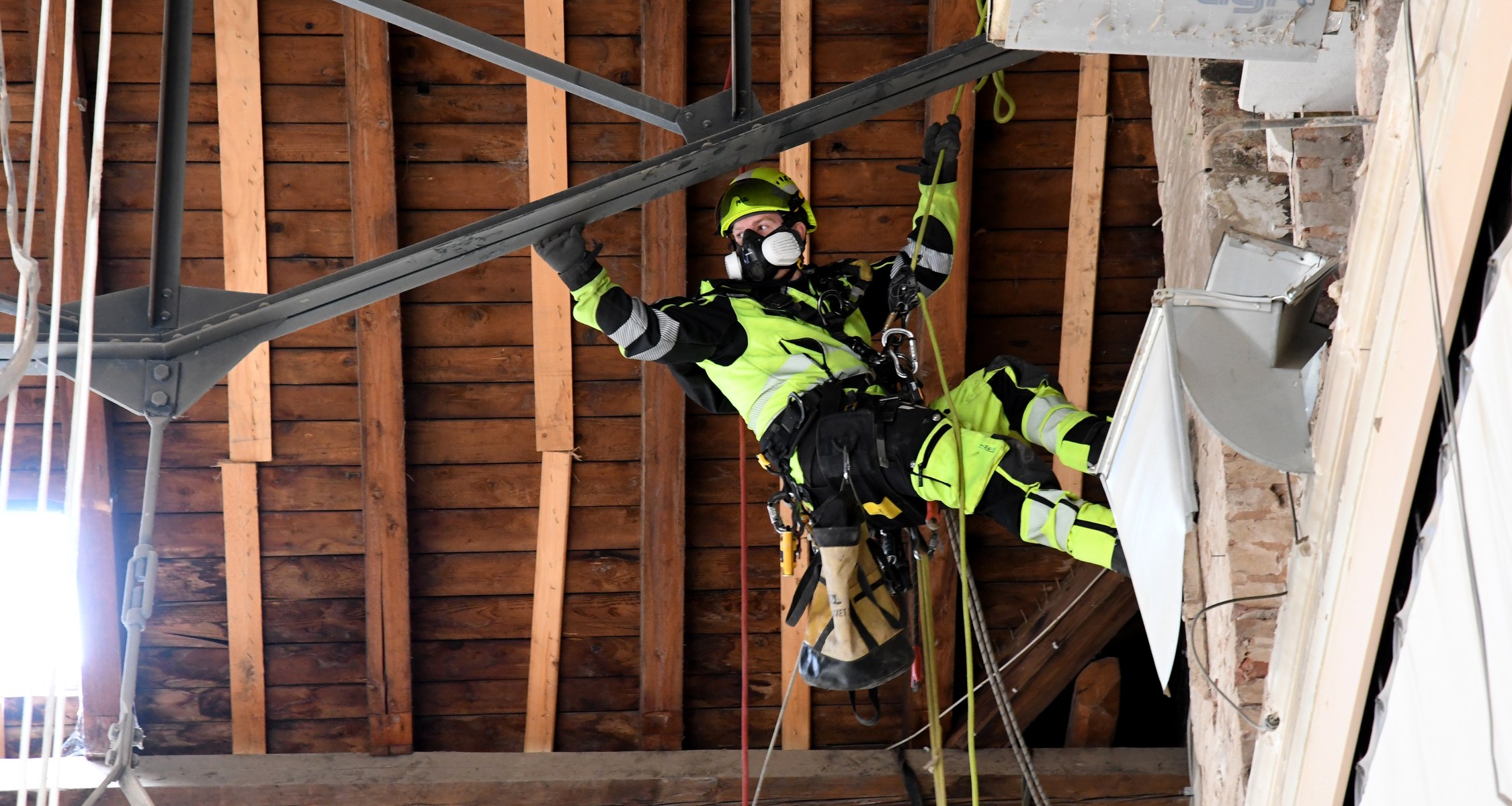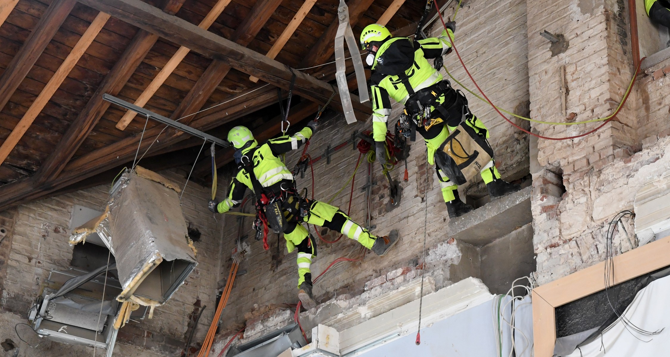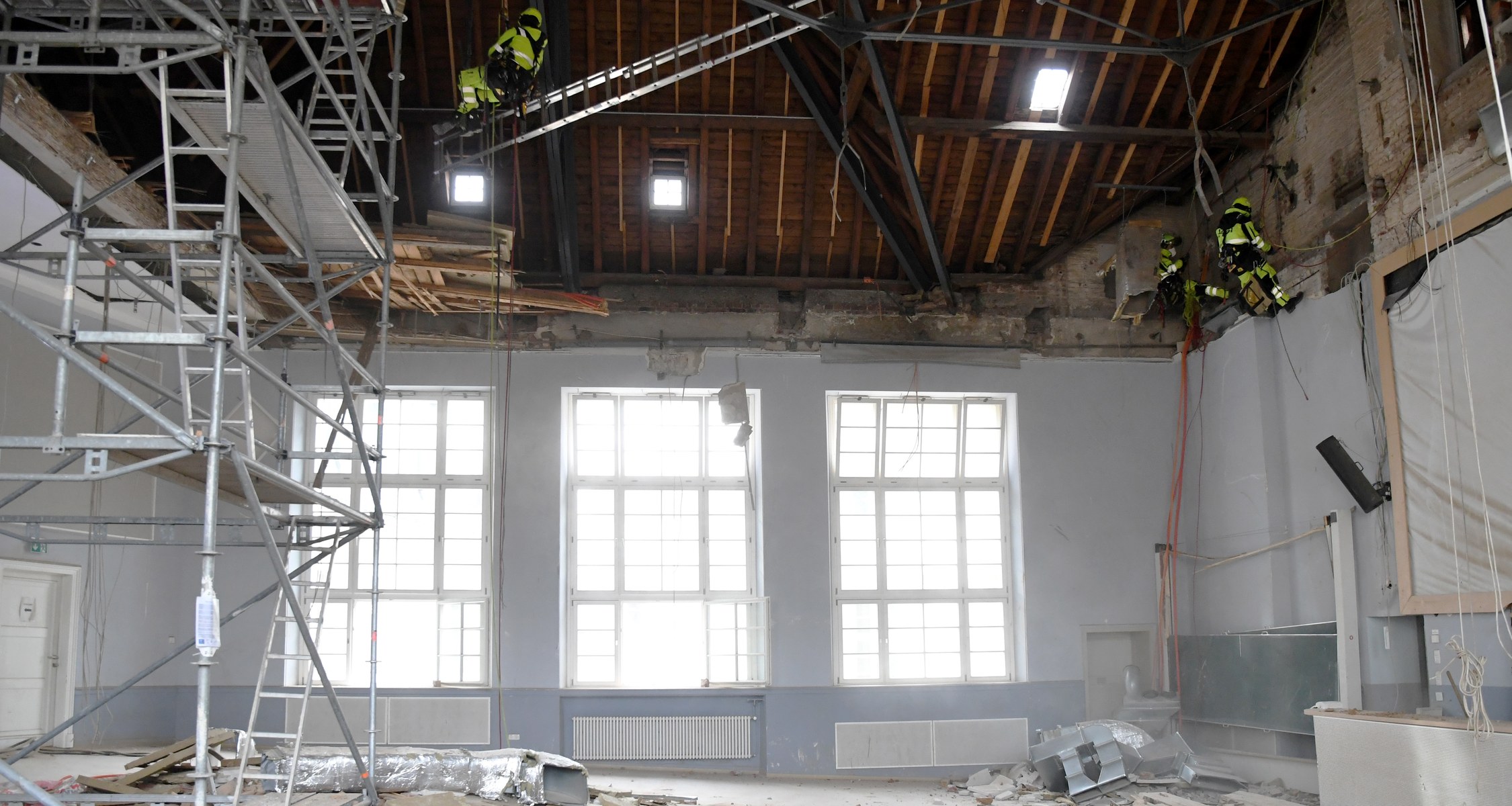Ein Großteil der Aufräumarbeiten im Landgrafenhaus der Philipps-Universität ist abgeschlossen. Aktuell entfernen Industriekletterer noch Schutt, der in mehreren Metern Höhe hängt und bisher nicht erreichbar war. Außerdem nehmen sie die metallenen Zugstäbe des Deckentragwerks ab. Diese werden dann einer Materialprüfung unterzogen, um die Ursache des Deckeneinsturzes Anfang Dezember 2023 weiter erforschen zu können.