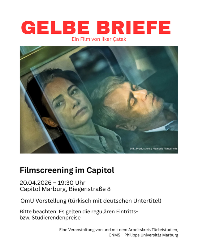 Der Arbeitskreis Türkeistudien lädt herzlich zu einem gemeinsamen Filmscreening ein. Gezeigt wird der Spielfilm Gelbe Briefe (türk. Sarı Zarflar von İlker Çatak. Der Film wird im Originalton (Türkisch) mit deutschen Untertiteln (OmU) gezeigt.