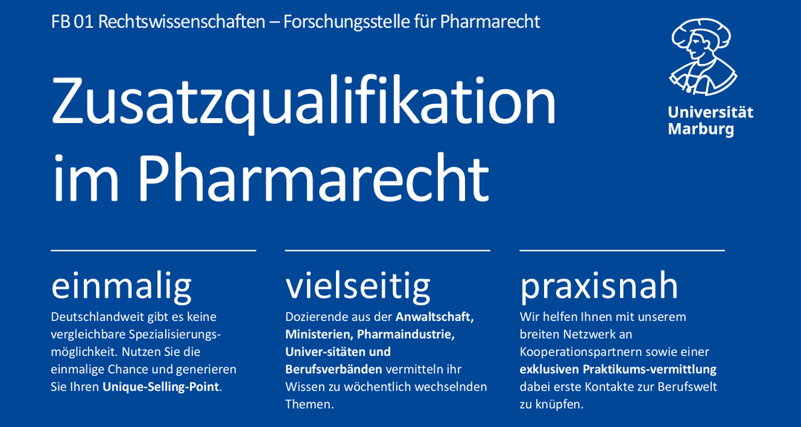 Zum kommenden Sommersemester 2026 können Sie sich wieder für die Zusatzqualifikation im Pharmarecht anmelden.