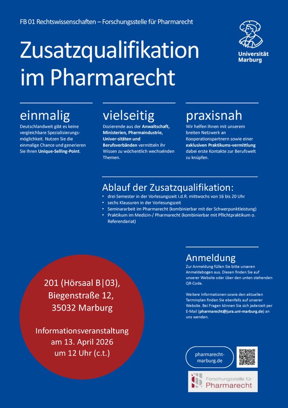 05.03.2026 Anmeldung zur Zusatzqualifikation im Pharmarecht im SoSe 2026