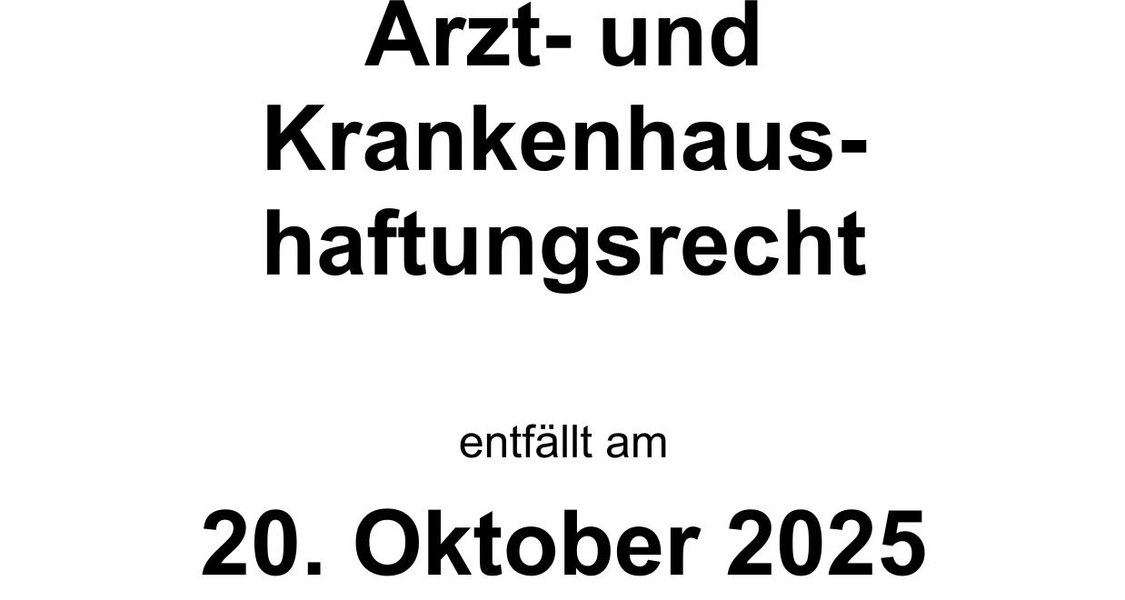 Am kommenden Montag, den 20.10.25, fällt die Vorlesung Arzt- und Krankenhaushaftungsrecht von Herrn Prof. Voit aus.