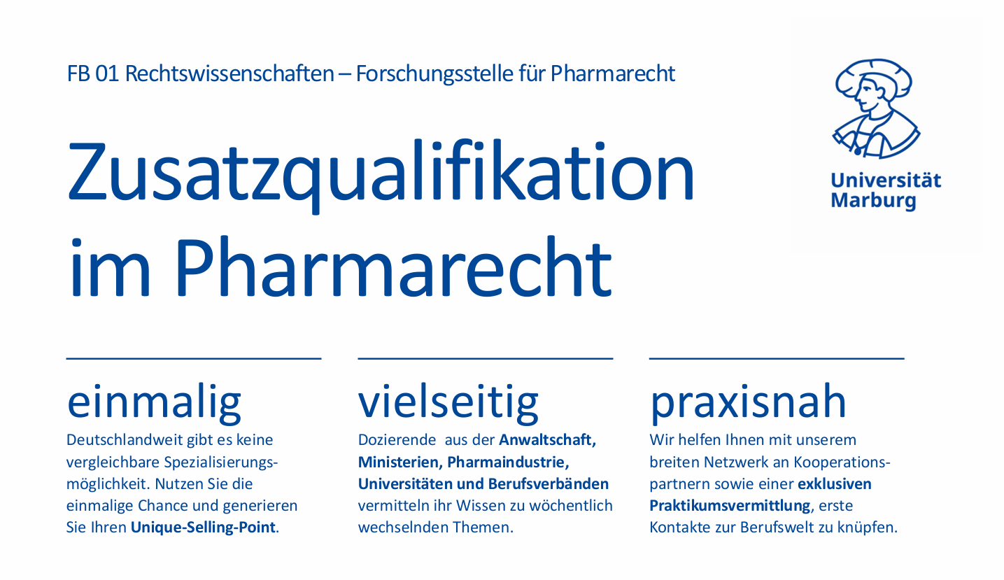 Anmeldung zur Zusatzqualifikation im Pharmarecht für das WiSe 2023/24 Anmeldung für die Zusatzqualifikation im Pharmarecht für das kommende Wintersemester ist ab sofort wieder möglich.