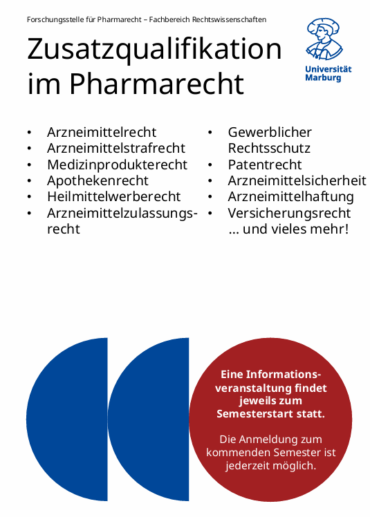 Mit der Zusatzqualifikation im Pharmarecht bietet der Fachbereich Rechtswissenschaften der Philipps-Universität Marburg eine deutschlandweit einzigartige Möglichkeit, sich bereits während des Studiums auf dem Gebiet des Pharmarechts fortzubilden. Das Angebot richtet sich primär an Studierende der Rechtswissenschaften der Philipps-Universität Marburg. Auf Antrag können jedoch auch Fachfremde zur Teilnahme an den Vorlesungen zugelassen werden und eine entsprechende Bescheinigung erhalten. Für Absolventinnen und Absolventen hingegen eignet sich der ebenfalls an der Forschungsstelle für Pharmarecht angeschlossene Masterstudiengang. Dieser ist verblockt und nimmt somit besondere Rücksicht auf die beruflichen Verpflichtungen der Teilnehmenden. Zudem nehmen die dortigen Veranstaltungen Rückgriff auf Ihre beruflichen Vorerfahrungen und bietet allen Berufstätigen eine gute Möglichkeit zur weiteren Vernetzung.
