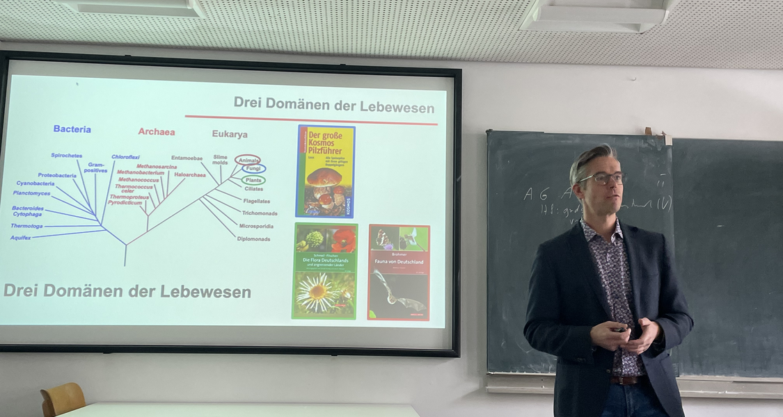 Am Freitag, 31. Oktober 2025, war Prof. Dr. Robert Junker, Evolutionäre Ökologie der Pflanzen, Fachbereich Biologie der Philipps-Universität Marburg, zu Besuch in der Umweltrechtsvorlesung von Frau Prof. Dr. Pernice-Warnke. In einem spannenden und anschaulichen Vortrag stellte er seine Forschung zur bedeutenden Rolle von Mikroorganismen dar. Es schloss sich eine engagierte Diskussion insbesondere über ihre bislang unzureichende Berücksichtigung in rechtlichen Instrumenten zum Natur- und Biodiversitätsschutz an.