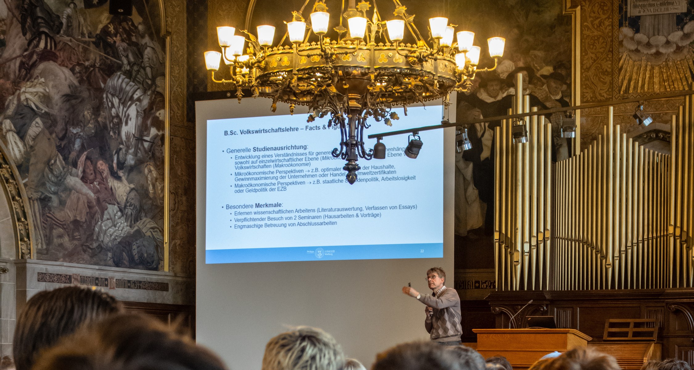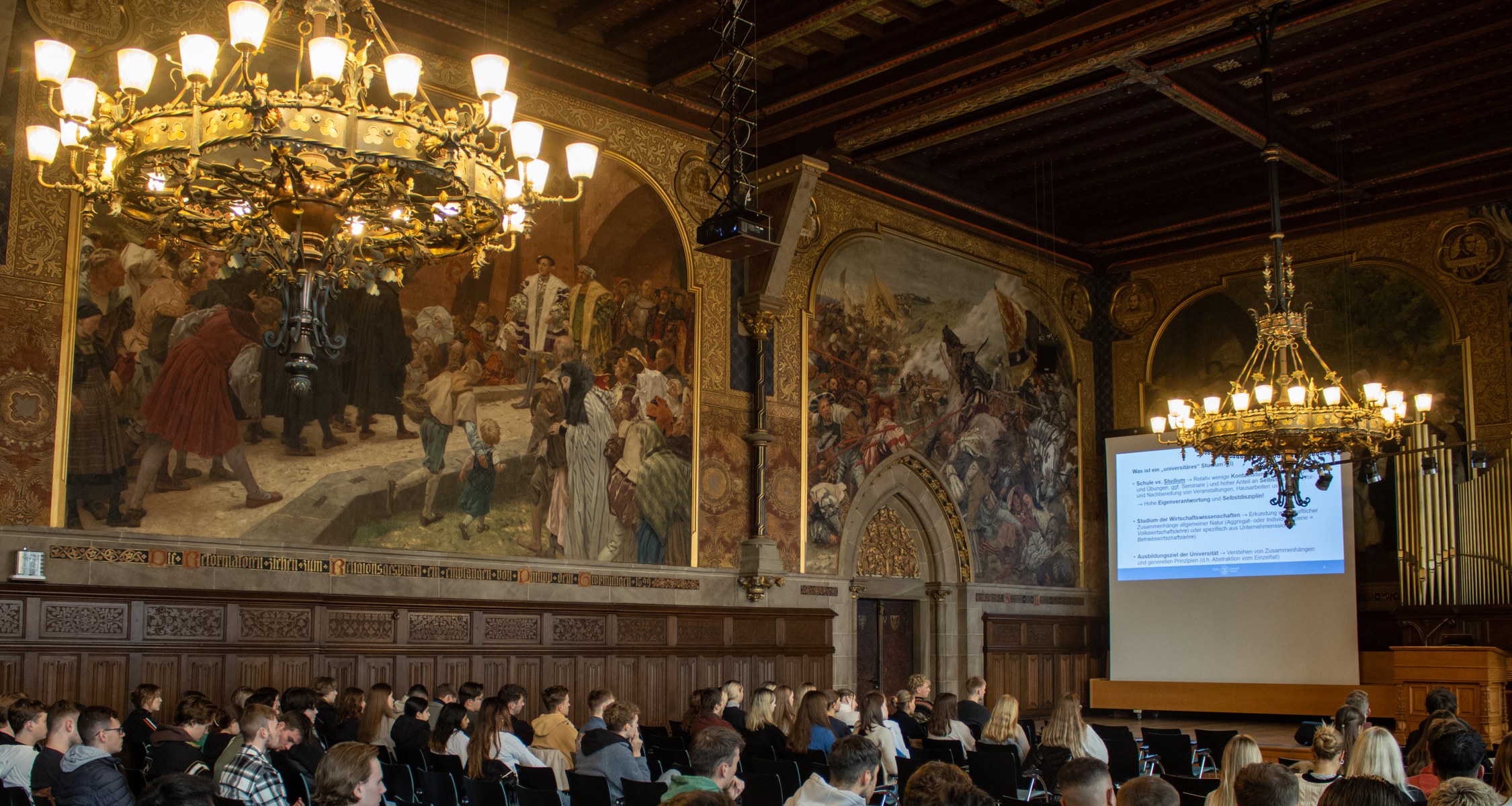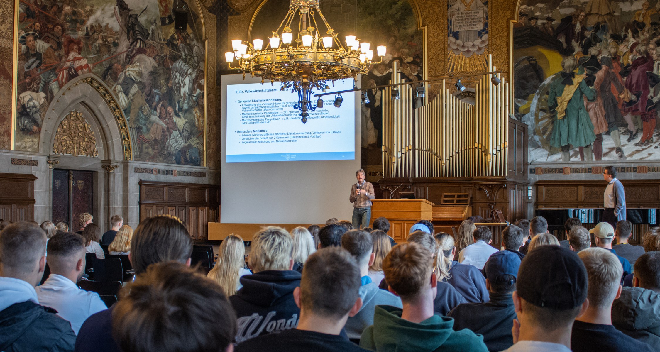 Am Montag, 16.10.2023, konnten der Studiendekan Prof. Dr. Sascha Mölls (BWL - AG Rechnungslegung) und der Prodekan Prof. Dr. Bernd Hayo (VWL - AG Makroökonomie) zahlreiche Erstsemesterstudierende am Fachbereich WIrtschaftswissenschaften begrüßen. Die Veranstaltung fand traditionell in der Aula der Alten Universität Philipps-Universität statt, und ließ neben einer kurzweiligen Einführung in das universitäre Studium Raum für Fragen und Austausch. Die Vortragsfolien finden Sie hier.