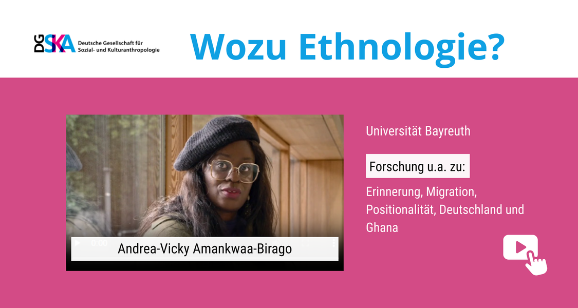 Im Rahmen der Videoreihe „Wozu Ethnologie? Why Anthropology Matters!“ der Deutschen Gesellschaft für Sozial- und Kulturanthropologie (DGSKA) spricht Andrea-Vicky Amankwaa-Birago (Universität Bayreuth) über die Bedeutung ethnologischer Forschung zu Erinnerung, Migration und Positionalität im Kontext von Deutschland und Ghana.