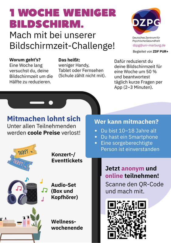 Eine Woche lang versuchst du, deine Bildschirmzeit um die Hälfte zu reduzieren. Das heißt: weniger Handy, Tablet oder Fernsehen (Schule zählt nicht). Anonym beantwortest du täglich per App kurze Fragen (2-3 Minuten). Am Ende weißt du nicht nur, was es mit dir macht, wenn du weniger Zeit an Bildschirmen verbringst. Du kannst auch an einer Verlosung teilnehmen: