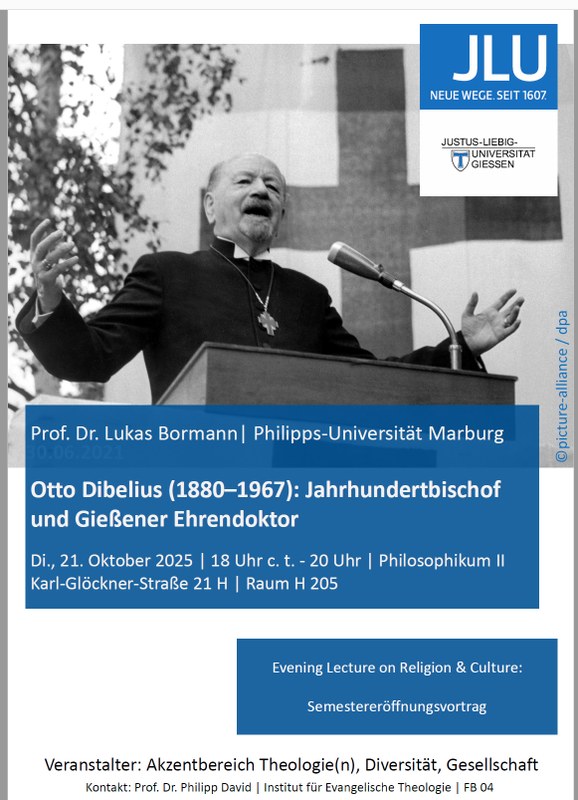 21. Oktober 2025 um 18 Uhr c.t Semestereröffnungsvortrag (Evening Lecture on Religion & Culture; JLU-Gießen): „Otto Dibelius (1880–1967): Jahrhundertbischof und Gießener Ehrendoktor“