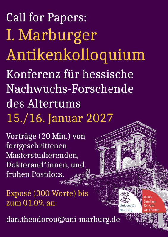 Das I. Marburger Antikenkolloquium ist eine interdisziplinäre Konferenz von und für hessische Nachwuchswissenschaftler*innen des Altertums. Das Kolloquium findet vom 15.-16.01.2027 in Marburg an der Lahn statt.