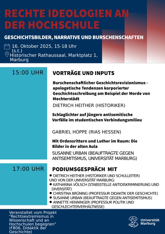 Pünktlich zum Semesterstart laden wir am Donnerstag, den 16.10.2025 von 15–18 Uhr (s. t.) herzlich ein zur Veranstaltung „Rechte Ideologien an der Hochschule. Geschichtsbilder, Narrative und Burschenschaften” im historischen Rathaussaal (Rathaus Marburg).
