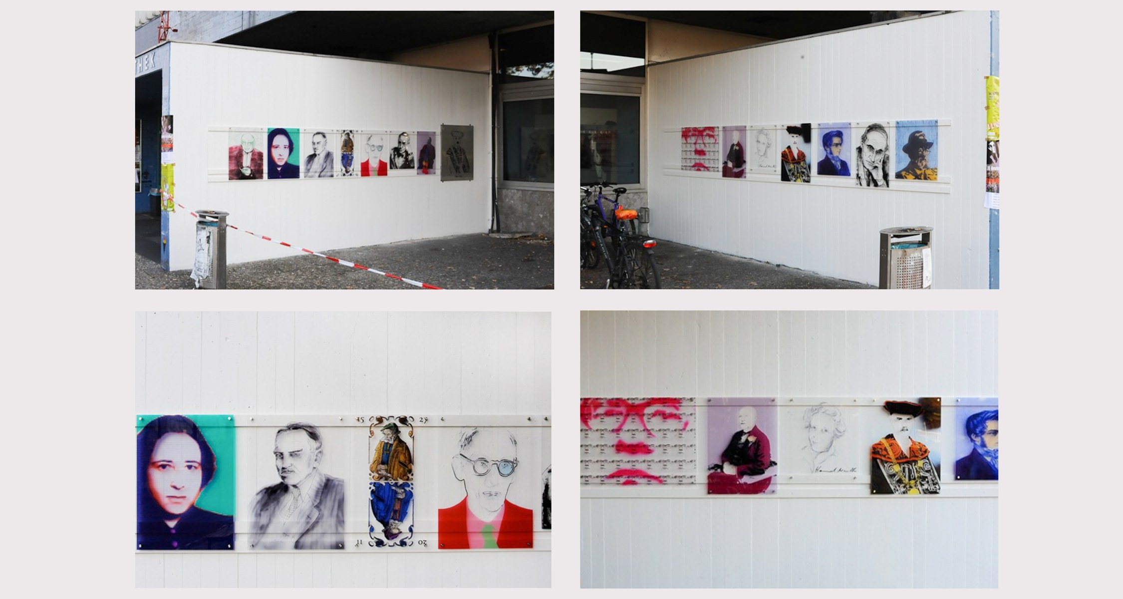 Seit dem 22. November 2011 schmücken den UB-Eingang berühmte Köpfe der Philipps-Universität. Studierende am Institut für Bildende Kunst sind im Sommersemester in die Geschichte der Philipps-Universität eingetaucht, auf der Suche nach Frauen und Männern aus fünf Jahrhunderten Wissenschaft und Forschung. Aufgabe der jungen Künstler in der Lehrveranstaltung von Prof. Eckhard Kremers war es, Bildvorlagen auf der Grundlage der überlieferten Porträts oder auch Fotografien dieser Berühmtheiten zu entwerfen. Mit verschiedensten Techniken - Digitaldrucktechnik, Sieb- und Hochdruck - haben acht Studierende Porträts Berühmter Köpfe gestaltet. Die Studierenden haben ihre Favoriten unter den Wissenschaftlern, Nobelpreisträgern, Lehrenden, und Studierenden der Philipps-Universität selbst gewählt.