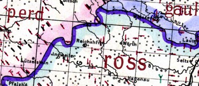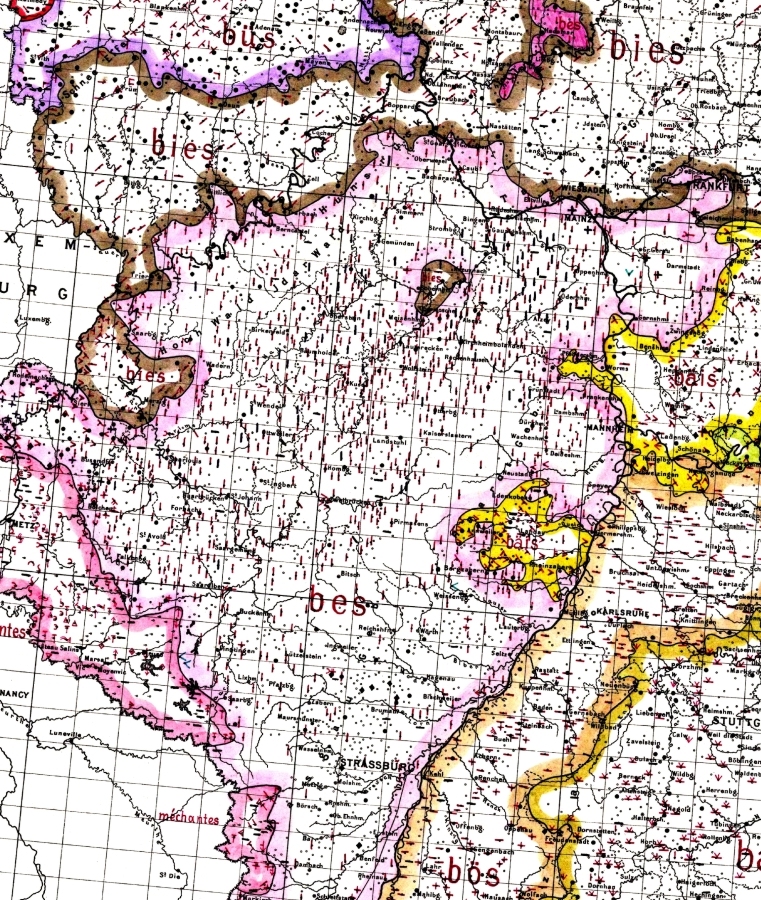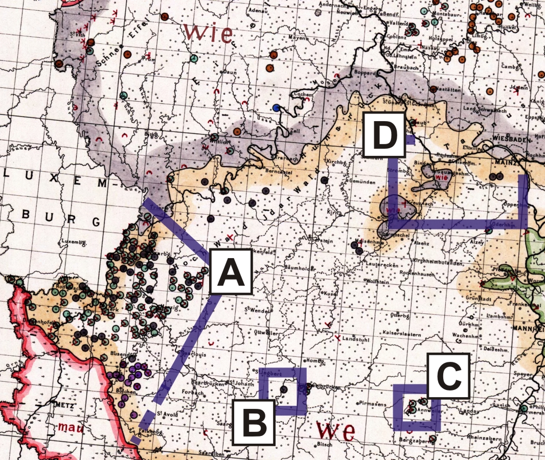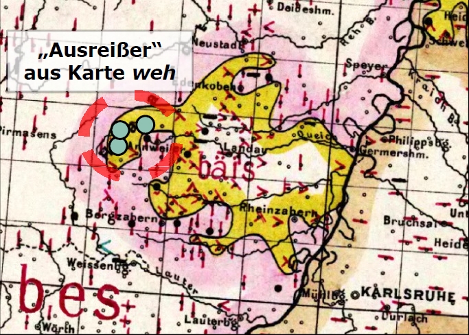 Überblendung der Wenker-Karte böse mit weh (1880, Ausschnitt: südpfälzisches Reliktgebiet)