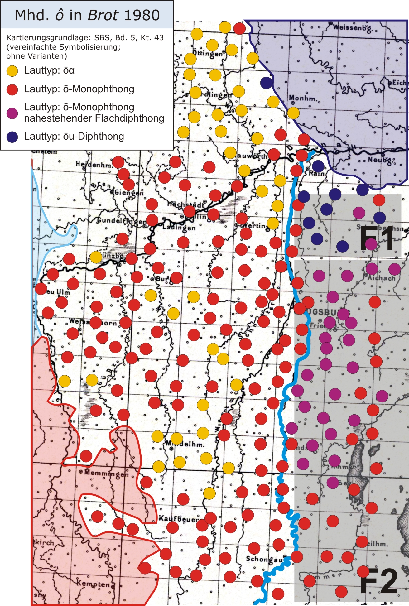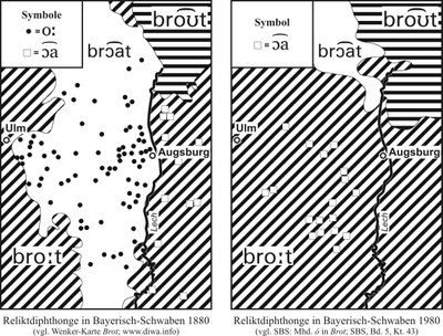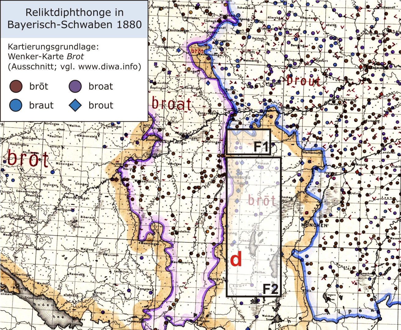 Reliktdiphthonge in Bayerisch-Schwaben 1880 (Wenker-Atlas Brot [Ausschnitt])