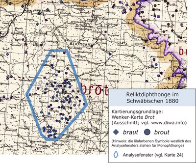Reliktdiphthonge im Schwäbischen 1880 (Wenker-Atlas Brot [Ausschnitt])