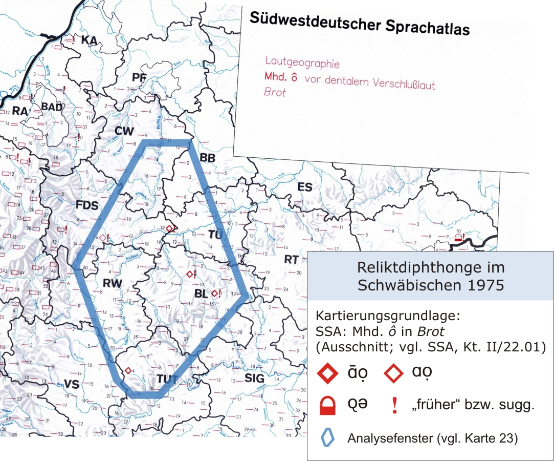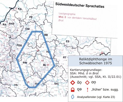Reliktdiphthonge im Schwäbischen 1975 (Südwestdeutscher Sprachatlas Brot)