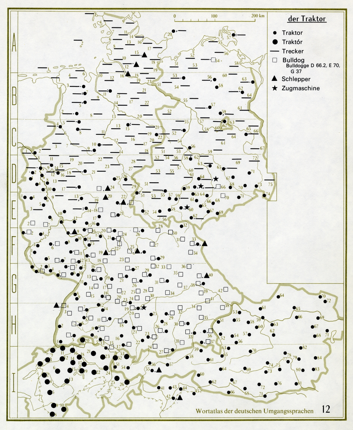Umgangssprachliche Heteronyme für ‚Traktor’ (Wortatlas der deutschen Umgangssprachen) (Eichhoff 1977, Karte 12)