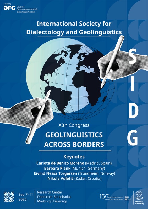 Vom 07. bis 11. September 2026 findet in Marburg der XIth Congress of the International Society of Dialectology and Geolinguistics (SIDG) mit dem Thema Geolinguistics across Borders statt. Alle Informationen zum Kongress finden Sie hier: https://sidg.dsa.info/.