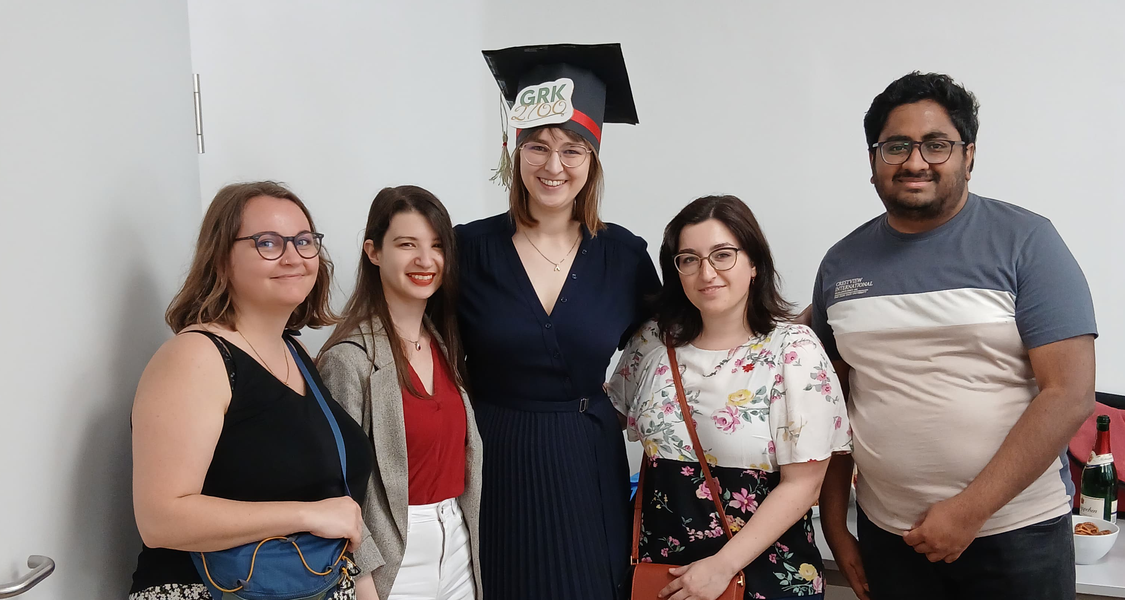 Simone Nopens (mitte) feiert mit GRK Kollegen (von links) Maria Luisa Krapp, Nadja Spina, Alexia Despina Leonidou und Postdoc-Vertretung Prajit Dhar ihre erfolgreiche Disputation.