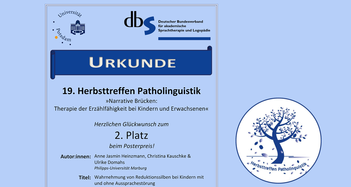 Letzten Monat war das GRK2700 beim 19. Herbsttreffen Patholinguistik der Universität Potsdam und des Deutschen Bundesverbands für akademische Sprachtherapie und Logopädie (dbs) vertreten. Doktorandin Anne Jasmin Heinzmann präsentierte Inhalte ihres Promotionsprojekts, mit Ergebnissen zur Sprachwahrnehmung bei Kindern mit Aussprachestörungen, und belegte mit ihrem Poster den zweiten Platz der Posterpreisverleihung.