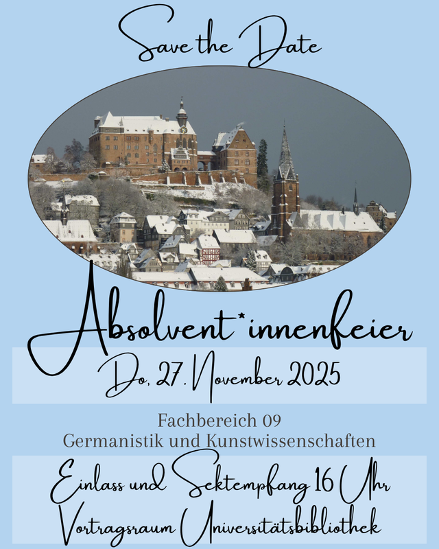 Am Donnerstag, den 27. November findet die Absolvent*innenfeier des Fachbereichs 09 statt. Der Einlass mit Sektempfang beginnt um 16 Uhr im Vortragsraum der Universitätsbibliothek, Deutschhausstraße 9. Die Feier ist für alle Studierenden und Doktorand*innen des Fachbereichs 09, die vor kurzem ihr Studium abgeschlossen oder ihre Doktorarbeit fertiggestellt haben. Bei Fragen wenden Sie sich an: absolv09@staff.uni-marburg.de. |