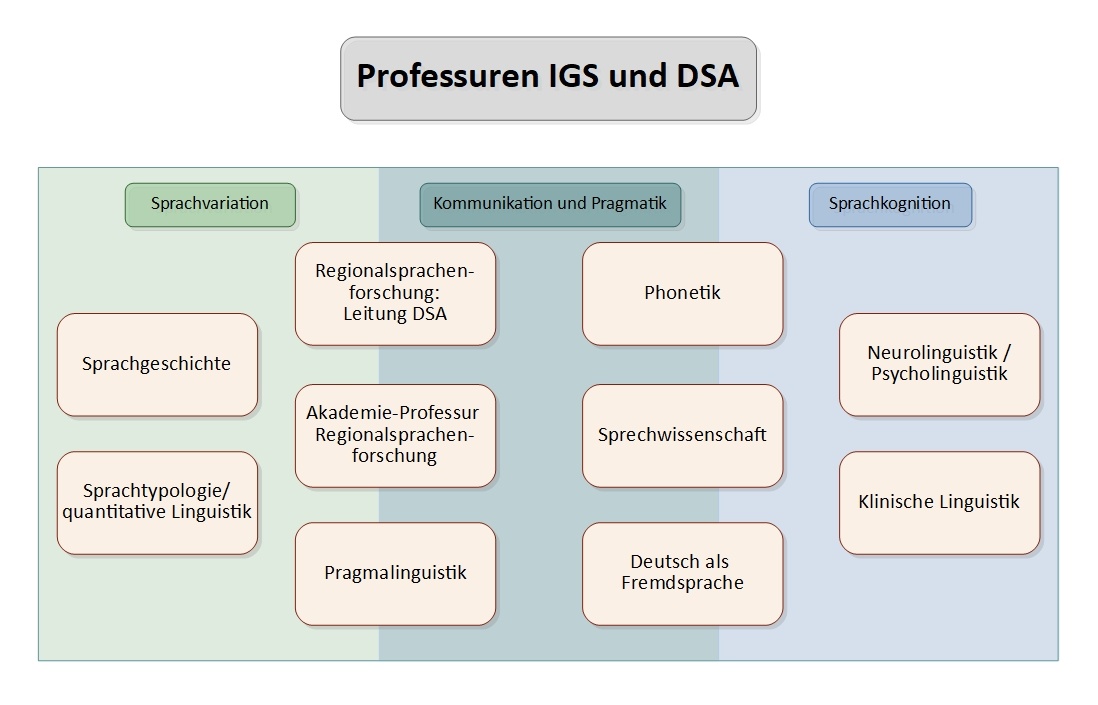 Das Institut für Germanistische Sprachwissenschaft bringt eine Reihe je unterschiedlich profilierte Professuren zusammen, die gemeinsam die Sprachwissenschaft des Deutschen in größter Breite abdecken. Diese Professuren behandeln spezialisiert die Bereiche: