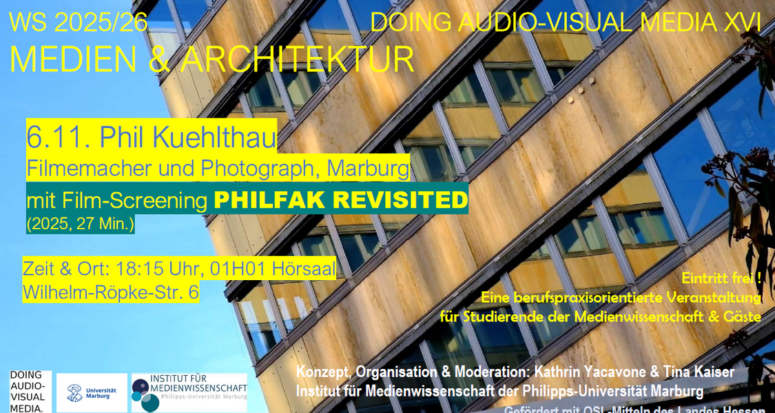 Die medienberufspraktische DOING AUDIO-VISUAL MEDIA-Reihe schließt ihr 10-jähriges Jubiläum dieses Jahr mit einem ganz besonderen Filmscreening mit anschließendem Publikumsgespräch für Studierende der Medienwissenschaft und weitere Interessierte ab: Zu Gast ist der Marburger Filmemacher und Fotograf Phil Kuehlthau, der einen besonderen Dokumentarfilm über das Gebäude - die PhilFak - gedreht hat, in welchem wir alle tagtäglich lernen, lehren, uns begegnen und arbeiten: PHILFAK REVISITED, Preisträgerfilm in der Kategorie "Dokumentarfilm" des Marburger Open Eyes Filmfestivals 2025.