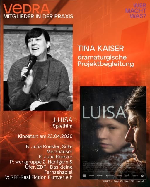 Die von Tina Kaiser über alle Drehbuchphasen bis in den Feinschnitt dramaturgisch beratene Spielfilmproduktion "LUISA" (R: Julia Roesler, P: werkgruppe2 / Hanfgarn&Ufer / ZDF - Kleines Fernsehspiel)) wird nach der Weltpremiere auf dem Int. Filmfestival Shanghai ab 23.4.2026 ihren Kinostart in Deutschland, Österreich und der Schweiz feiern.