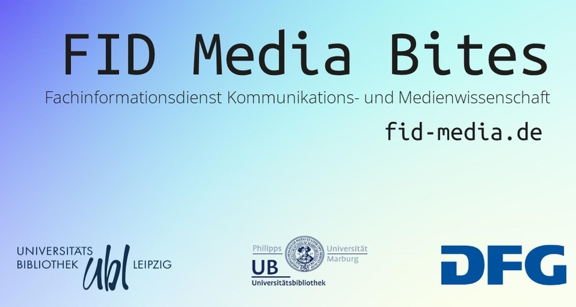 Die FID Media Bites bieten praxisnahe Wissenshappen für die Kommunikations- und Medienwissenschaft. Zu jedem Termin steht ein Thema aus den Bereichen wissenschaftliches Publizieren, Urheberrecht, Open Science, Tools oder Forschungsdaten im Mittelpunkt, und zwar jeweils mit dem Fokus auf den fachspezifischen Rahmenbedingungen.