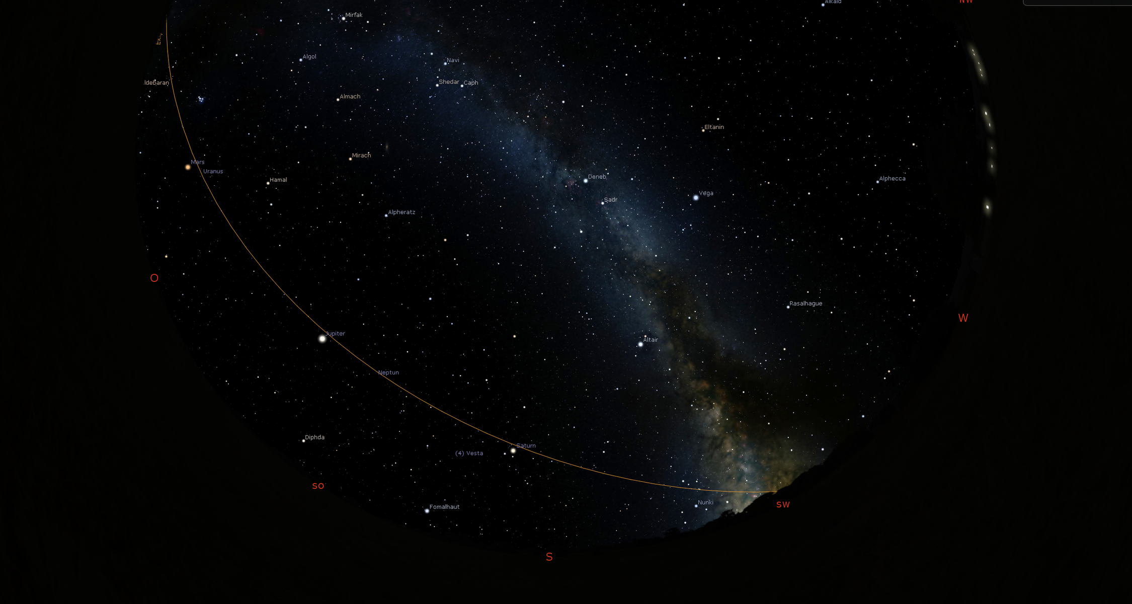 In dieser Nacht haben Sie rein theoretisch die Möglichkeit, alle äußeren Planeten zu bewundern. Pluto – er ist seit 2006 als Kleinplanet klassifiziert – bildet den westlichen Anfang der Parade. Er steht um 0:15 Uhr im Süden. Allerdings ist er aufgrund seiner großen Entfernung nur in größeren Teleskopen beobachtbar. Der nächste in der Reihe ist vermutlich der Planet mit dem außergewöhnlichsten Anblick in unserem Planetensystem, der Saturn mit seinem markanten Ringsystem. Er geht kurz nach 21 Uhr auf, steht um Mitternacht etwa 18° über dem Horizont. Ab etwa 23 Uhr kann er bewundert werden.
