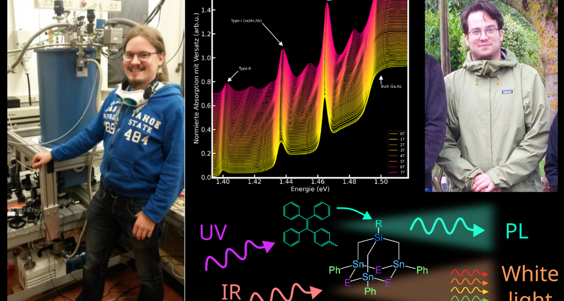 Johannes investigated the absorption of so-called type-II quantum well structures. These systems are interesting for applications as infrared emitters, but the properties of so-called charge transfer excitons, which are formed across the heterointerface after photoexcitation, are not yet well explored. Johannes studied different quantum well structures with charge transfer excitons at low temperatures in strong magnetic fields up to 7 Tesla. Under these conditions he could, for the first time, explore the magnetic properties of charge transfer excitons, such as Landau quantization and Zeeman splitting. His results showed excellent agreement with a microscopic theory developed in the group of Prof. Torsten Meier (U. Paderborn). The theoretical and experimental results were recently published in collaboration with AG Koch, AG Heimbrodt, AG Meier and AG Stolz (Physical Review B 110, 195306, 2024).