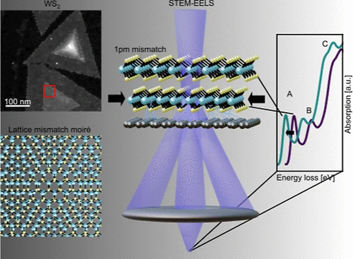 Understanding excitons in realistic two-dimensional heterostructures is a key prerequisite for next-generation optoelectronic and quantum devices. Yet in epitaxially grown 2D materials, subtle structural distortions introduced during growth often remain invisible to conventional optical spectroscopy. In a recent article published in ACS Nano, Max Bergmann, Kerstin Volz, Stefan Wippermann and collaborators combine nanometer-resolved electron energy-loss spectroscopy with ab initio simulations to uncover the microscopic origin of excitonic shifts in epitaxial WS₂ grown on graphene. The study reveals a systematic redshift of the A and B excitons with increasing layer number and demonstrates that this shift is not primarily caused by dielectric screening, as commonly assumed, but by minute lattice-constant mismatches between WS₂ layers induced by heteroepitaxial alignment to the graphene substrate. High-resolution STEM measurements directly visualize the resulting lattice-mismatch moiré pattern, while Bethe–Salpeter calculations establish a quantitative link between strain, electronic structure and excitonic response. By connecting nanoscale structural distortions to excitonic properties in scalable, gas-phase-grown heterostructures, the work provides new insight into the design of realistic 2D material platforms for exciton-based optoelectronic devices. The work is published in ACS Nano.