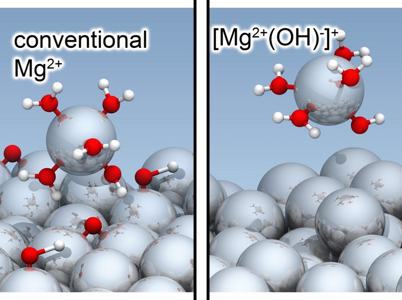 Aqueous metal corrosion is a major economic concern in modern society. A phenomenon that has puzzled generations of scientists in this field is the so-called anomalous hydrogen evolution: magnesium, prized for its light weight, dissolves violently under electron-deficient (anodic) conditions, accompanied by strong hydrogen evolution. This effect is a key mechanism hampering Mg technology. Experimental studies have indicated the presence of univalent Mg+ in solution, but these findings have been largely ignored because they defy our common chemical understanding and evaded direct experimental observation. Using recent advances in the ab initio description of solid-liquid electrochemical interfaces under controlled potential conditions, the groups of Prof. Wippermann and Prof. Neugebauer (MPI Düsseldorf) traced the full reaction path of Mg atom dissolution under anodic conditions and uncover a surprising twist: the research reveals that magnesium instead forms a unique [Mg²⁺(OH)⁻]⁺ complex, explaining the elusive Mg⁺ ions observed experimentally and the absence of protective oxide layers on corroding magnesium. This discovery paves the way for new anti-corrosion strategies for magnesium and other metals. The work is published in the Journal of the American Chemical Society (JACS).