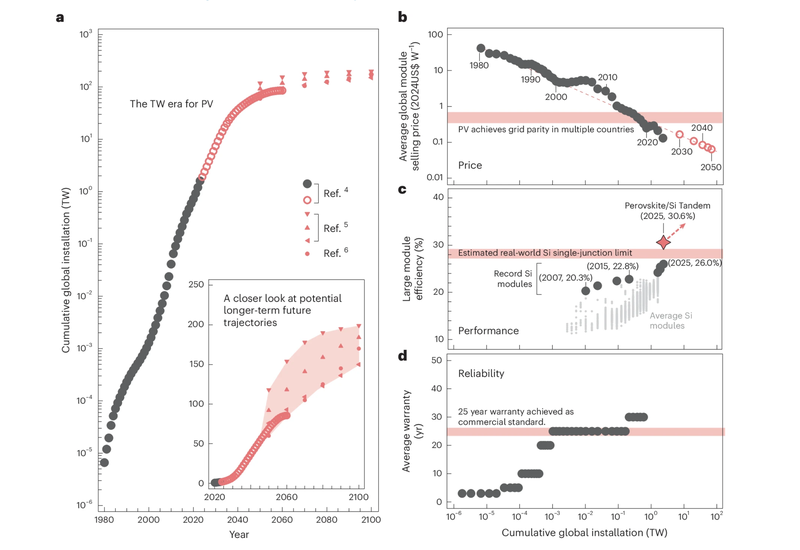 Für die Photovoltaik beginnt eine neue Ära mit einer global installierten Leistung von mehreren Terawatt (TW). Bereits 2 TW (=2000 GW) sind installiert und manche Szenarien gehen von bis zu 75 TW im Jahr 2050 aus. Zusammen mit einer weltweiten Gruppe Forschenden haben wir die Erfolgsfaktoren der rasanten historischen Entwicklung analysiert: Sich gegenseitig verstärkende Prozesse von technologischem Lernen, Kostenreduktion, höheren Wirkungsgraden, und größerer Langlebigkeit und exponentiellem Wachstum. Für die Zukunft gilt es nun diese Entwicklungstrends fortzusetzen, und weitere Reduktionen von Material- und Energieverbrauch, sowie Recyclingkonzepte in den Fokus zu rücken. Das Paper „Historical and future learning for the new era of multi-terawatt photovoltaics“ wurde in Nature Energy publiziert. DOI: 0.1038/s41560-025-01929-z