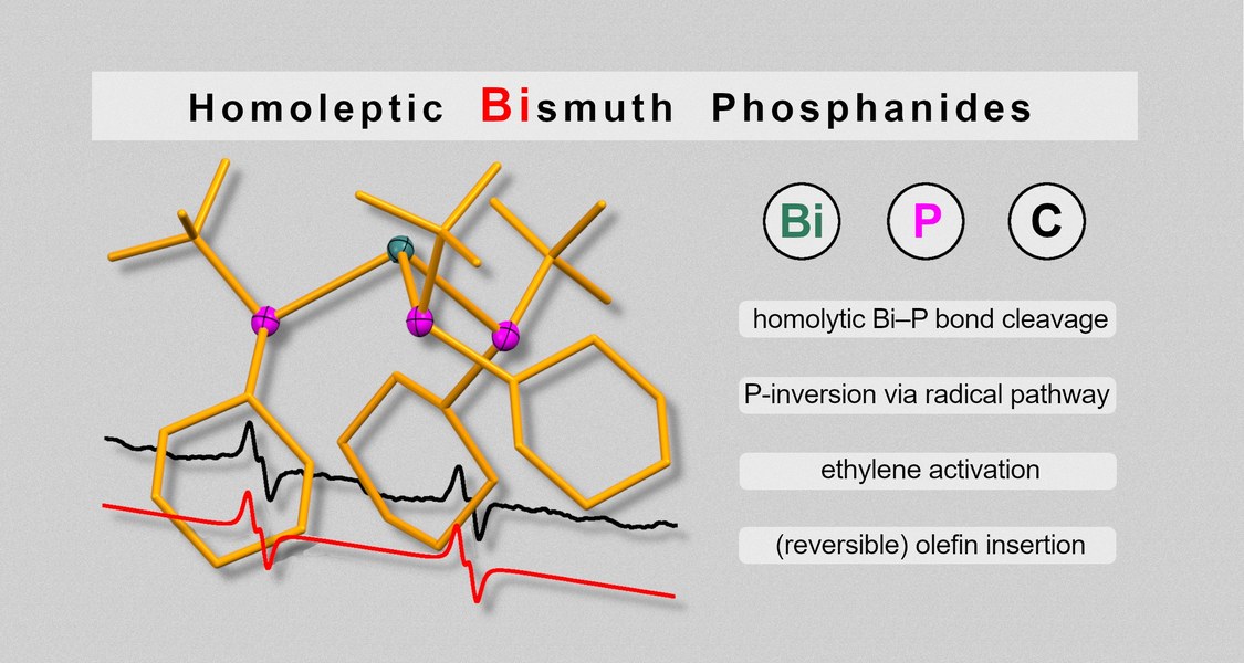 Homoleptische Bismutphosphanide Bi(PR2)3 konnten erstmals synthetisiert und isoliert werden. Aufgrund der geringen Bi–P Bindungsdissoziationsenergie setzen die Verbindungen unter sehr milden Reaktionsbedingungen kontrolliert Phosphaphanylradikale (PR2)• frei, wie EPR-spektroskopisch gezeigt werden konnte. Dies offenbart einen neuartigen Reaktionspfad zur Inversion von PR3-Gruppen. In der Folge konnten Phosphaphanylradikale selektiv und zum Teil reversibel auf externe Substrate wie CS2, Ethen und α-Olefine übertragen werden. Die Ergbnisse wurden kürzlich zur Publikation in Chem. Sci. angenommen - herzlichen Glückwunsch an alle Beteiligten!