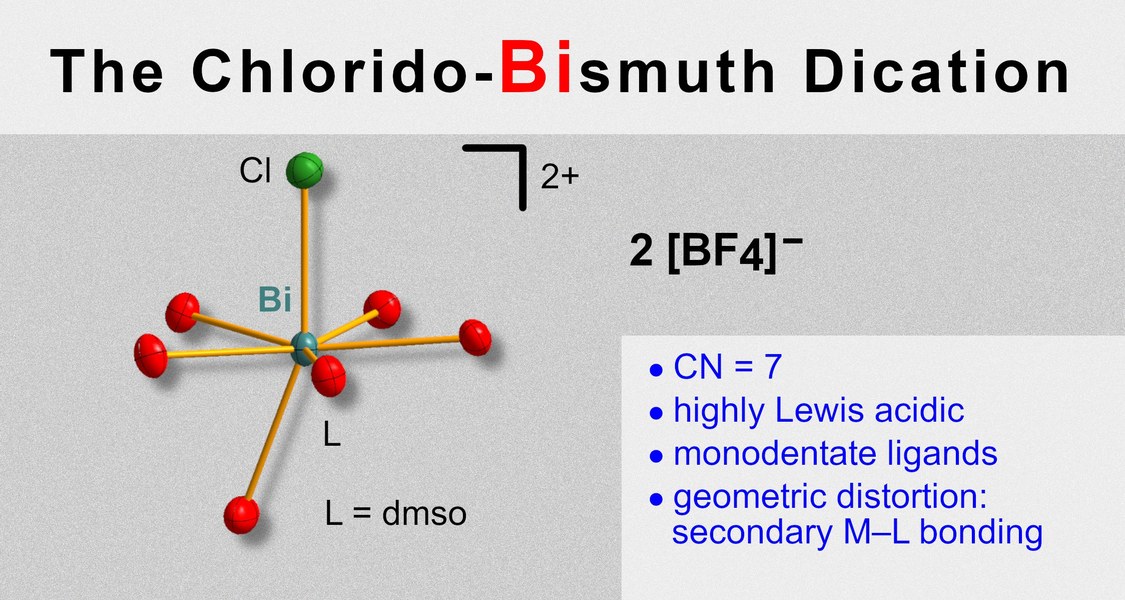 Das Chlorido-Bismut Dikation: Das reaktive Komplexfragment [BiCl]2+ konnte erstmals mithilfe einfacher monodentater Neutralliganden stabilisiert und isoliert werden. Die resultierende Verbindung [BiCl(dmso)6][BF4]2 zeigt eine ungewöhnliche Koordinationszahl von sieben, eine Verzerrung des Koordinationspolyeders durch sekundäre Bindungswechselwirkungen und eine ausgeprägte Lewis-Acidität. Die Ergebnisse wurden jüngst zur Publikation in Inorg. Chem. angenommen. Herzlichen Glückwunsch an das Team und unseren Erstautor, Ahmed!