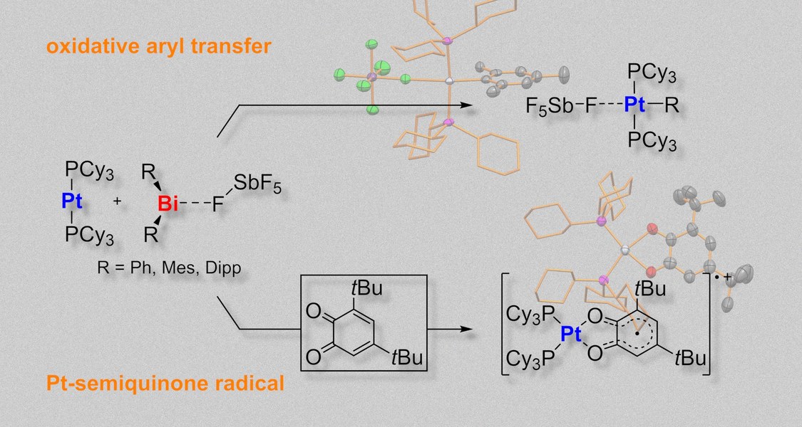 Bismut trifft Platin (#1): Kationische Diarylbismut-Komplexe reagieren mit einer elektronenreichen Platin(0)-Verbindung in unerwarteter Weise. Ein präzendensloser oxidativer Transfer eine Arylgruppe vom Bismutatom auf das Platinatom wird beobachtet, was mit einer Oxidation zu Platin(II) einhergeht. Die Platinkomplexe konnten isoliert und charakterisiert werden. In dem Versuch, das zugleich gebildete niedervalente Bismut-Koppelprodukt abzufangen wurde ein neuartiger Pt(II)-Komplex mit einem Semichinon-Radikalliganden erstmals isoliert und charakterisiert. Das unerwartete Reaktionsgeschehen wurde über spektroskopische Reaktionsverfolgung und theoretische Rechnungen rationalisiert. Die Arbeit wurde kürzlich in Organometallics zur Veröffentlichung angenommen - herzlichen Glückwunsch an Johannes und Cissie!